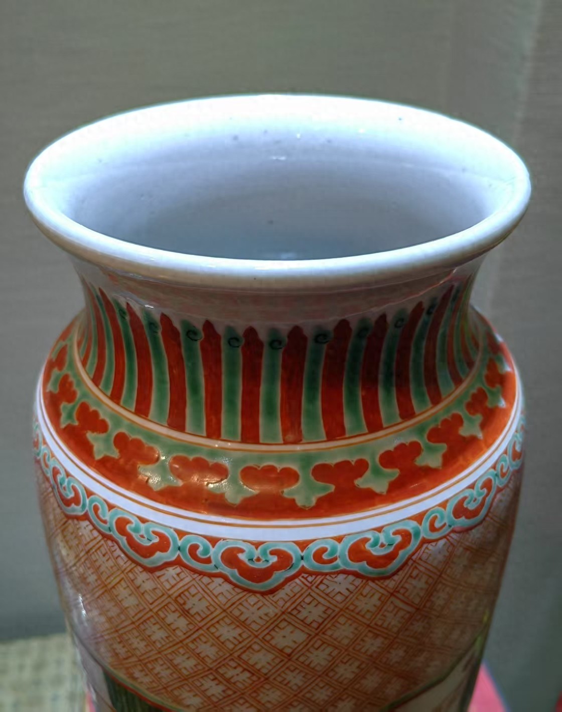 明末是五彩瓷器的鼎盛时期,五彩工艺以釉上彩为主,使用红、黄、绿、蓝、紫等多种色彩,呈现出艳丽而富有层次感的装饰效果。大筒瓶作为陈设器,兼具实用性与观赏性,深受文人雅士和贵族阶层的喜爱。