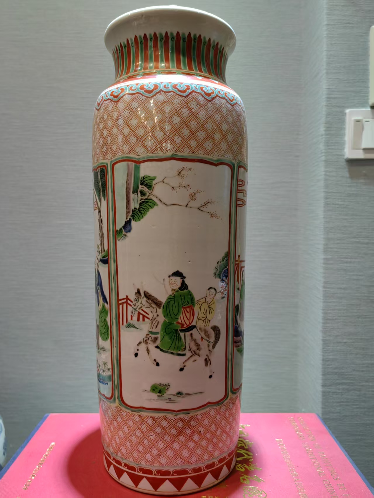 明末(约17世纪)的五彩开窗人物故事纹大筒瓶是中国瓷器史上的经典之作,以其华丽的装饰、精湛的工艺和丰富的文化内涵,成为明末五彩瓷器的代表作品。以下是对其的详细介绍:
