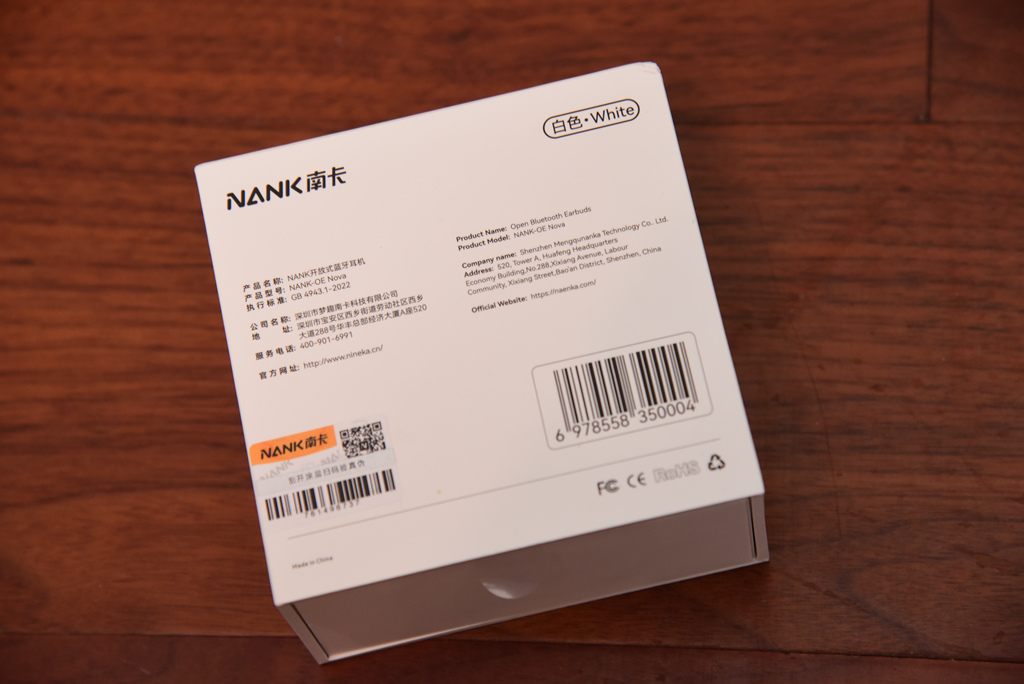 南卡OE-NOVA耳机的包装采用白色硬纸材质,包装盒上标识着产品的型号和特点。