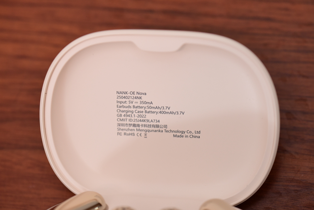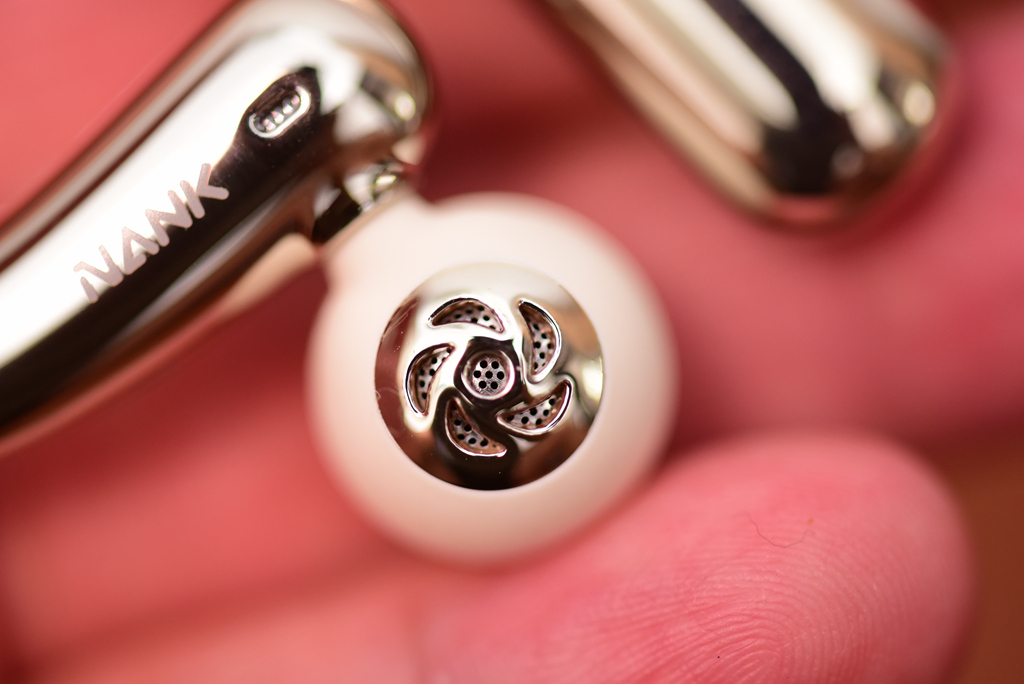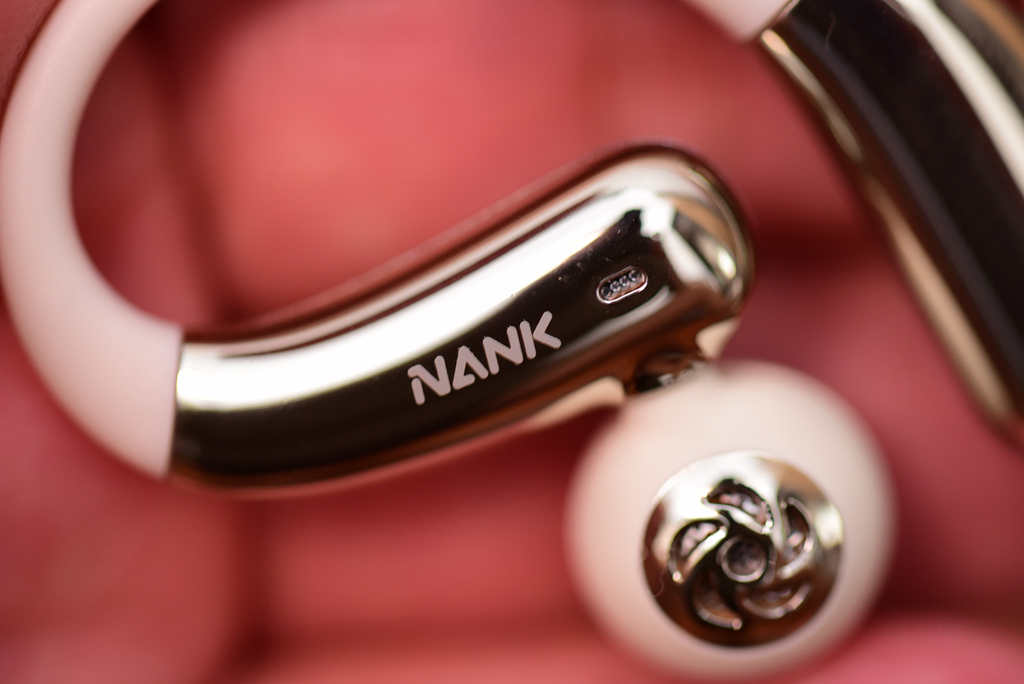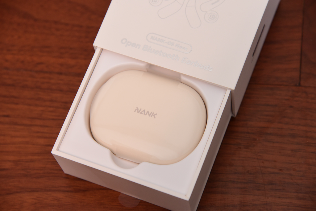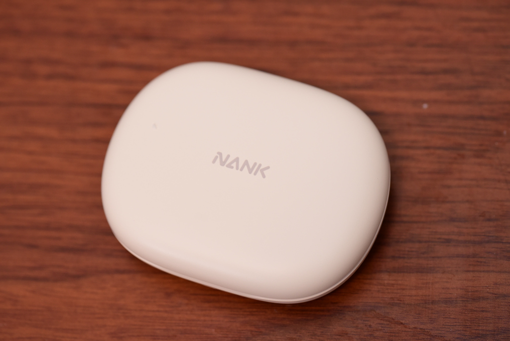 耳机仓为椭圆形设计,正面有“NANK”的LOGO。肤白色的风格,类肤质材质,握在手中,温润舒适。