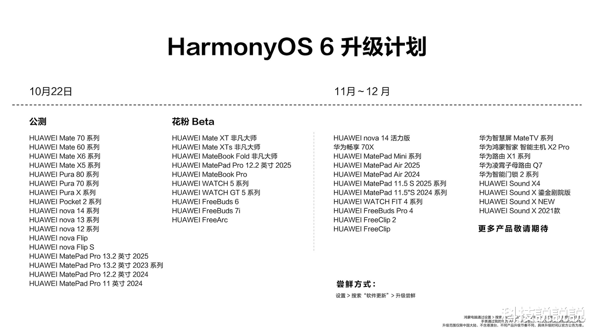 10月22日起,HarmonyOS 6面向首批90多款机型陆续开放升级。用户可以在系统设置软件更新和“我的华为”App首页直接申请升级尝鲜。加入公测,抢先体验新一代鸿蒙操作系统的强大魅力!