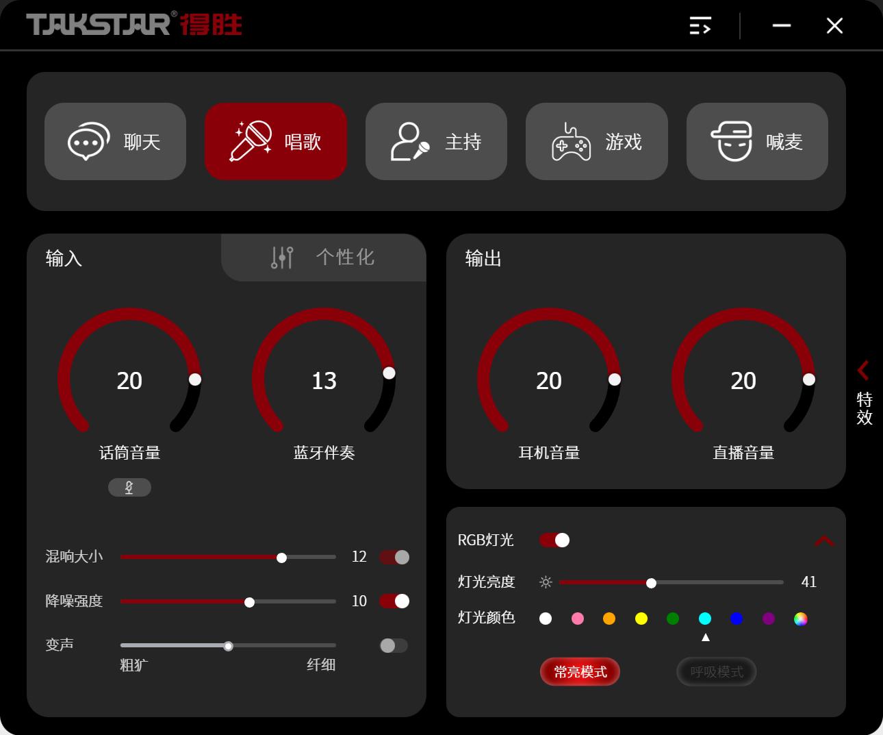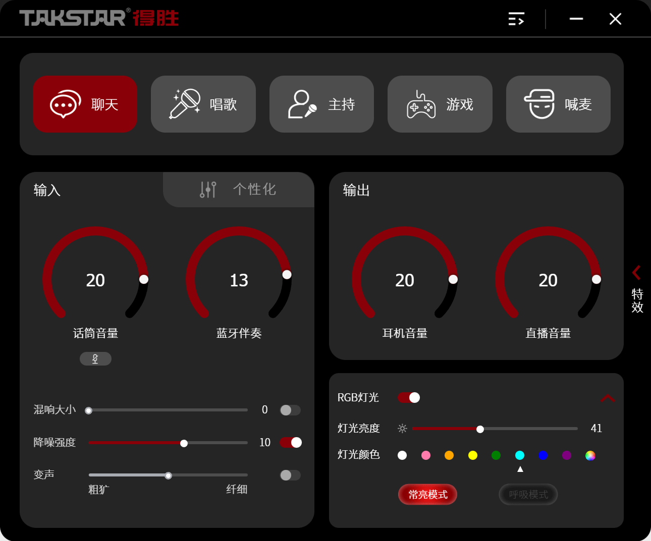 软件界面直观,提供五种预设效果模式(聊天、唱歌、主持、游戏、喊麦),每种模式都可进行细化调整。