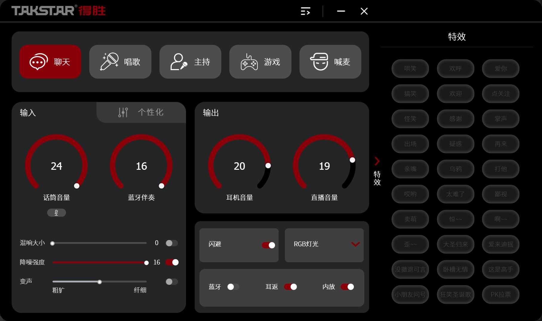 2. 丰富效果:16级混响、智能降噪、变声等功能齐全