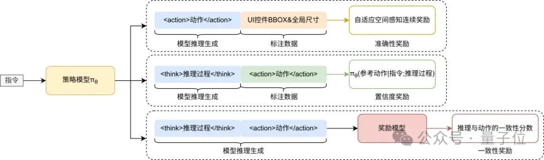 解决了“认知不协调”问题。例如,模型推理“需要点击登录按钮”,却执行了“点击注册按钮”的操作。该奖励模型强制智能体的“思考”与“行动”对齐,这对于复杂任务中的可解释性和故障排查至关重要。