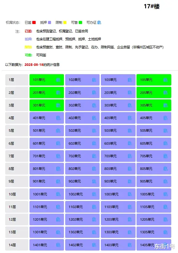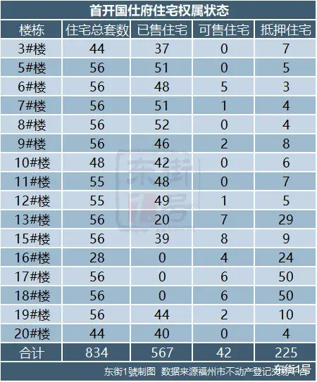 东街1號在福州市不动产登记交易平台查询到,首开国仕府(备案名:首开紫樾花园)17号楼共56套住宅,其中50套房源都处于“抵押”状态。