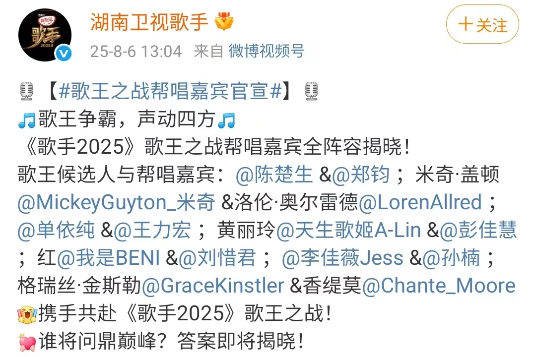当《歌手2025》的帮帮唱嘉宾名单一经公布,网络与坊间相关的喧嚣便变成了热闹。两者的区别在于,前者多无序与混乱,后者更有序而理性。
