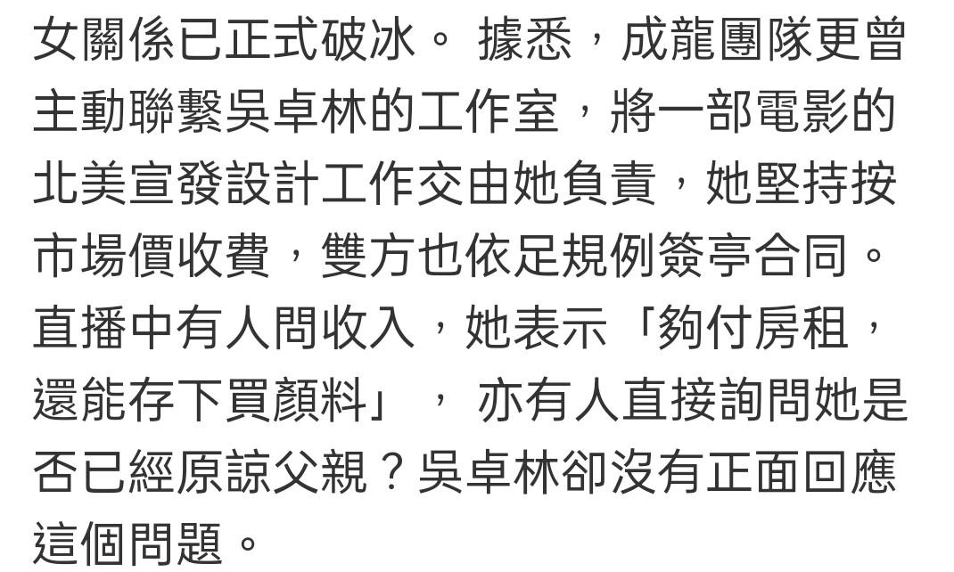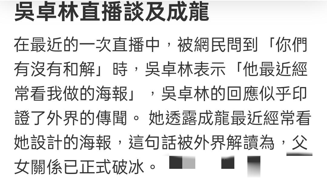 据港媒报道,吴卓林在最近的一次直播当中,被网友问到与成龙有没有和解?吴卓林没有回避,回答道:“他最近经常看我做的海报。”大家听完后都觉得他与成龙的关系这是破冰了。