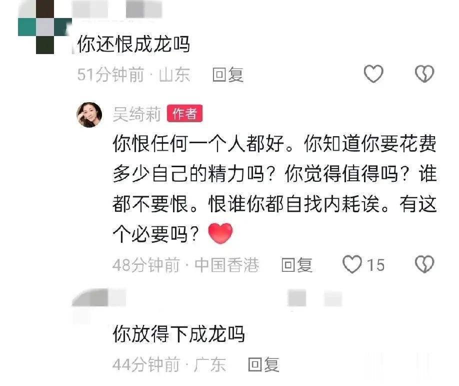 妈妈吴绮莉这边,也开始回归大众视野,拍视频开启直播带货,日常发出来的“心灵鸡汤”都是积极向上,虽说她的评论区也是绕不开成龙,不过她也大方面对不避讳,做这行估计也早有这方面心里准备的。