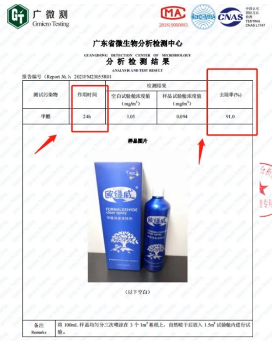 欧绿威甲醛清除剂采用 “氨基酸 + 光触媒” 双效技术,能有效分解甲醛。光触媒技术成熟,虽有短板,但在有光环境下可对甲醛进行分解。而氨基酸物理除甲醛技术弥补了光触媒对光源的依赖,可在无光或暗光环境中,全天候 24 小时不间断地对室内及板材、空气中残余的甲醛进行全面清除,对甲醛等有害物质的清除率高达 91% 以上 。
