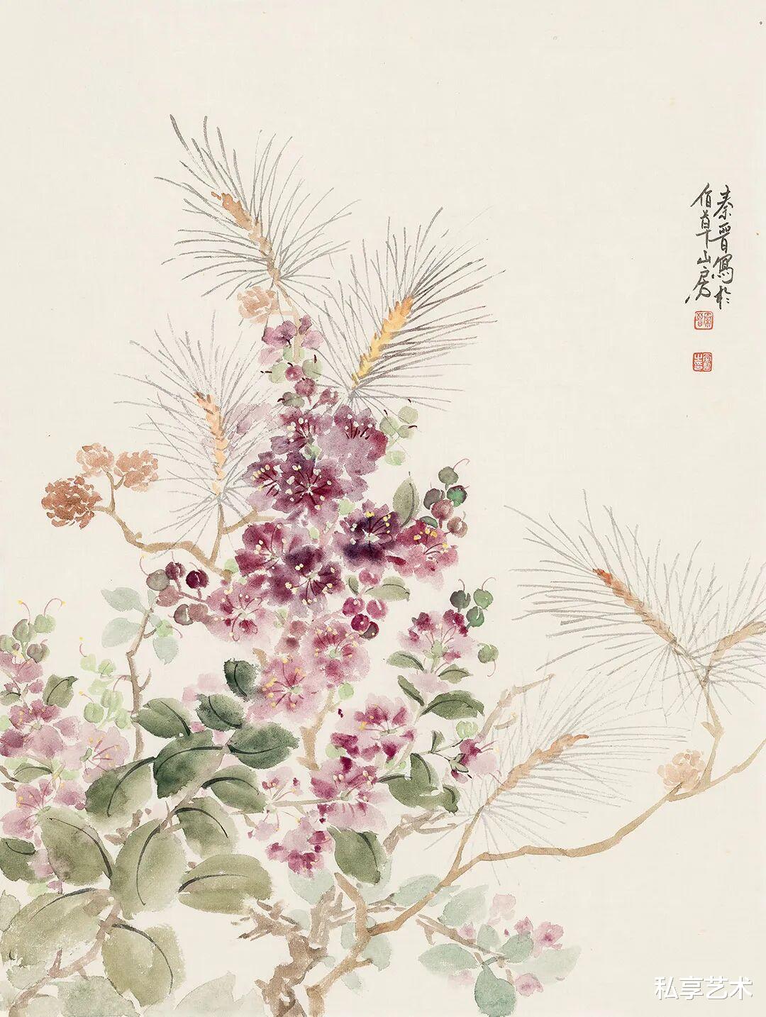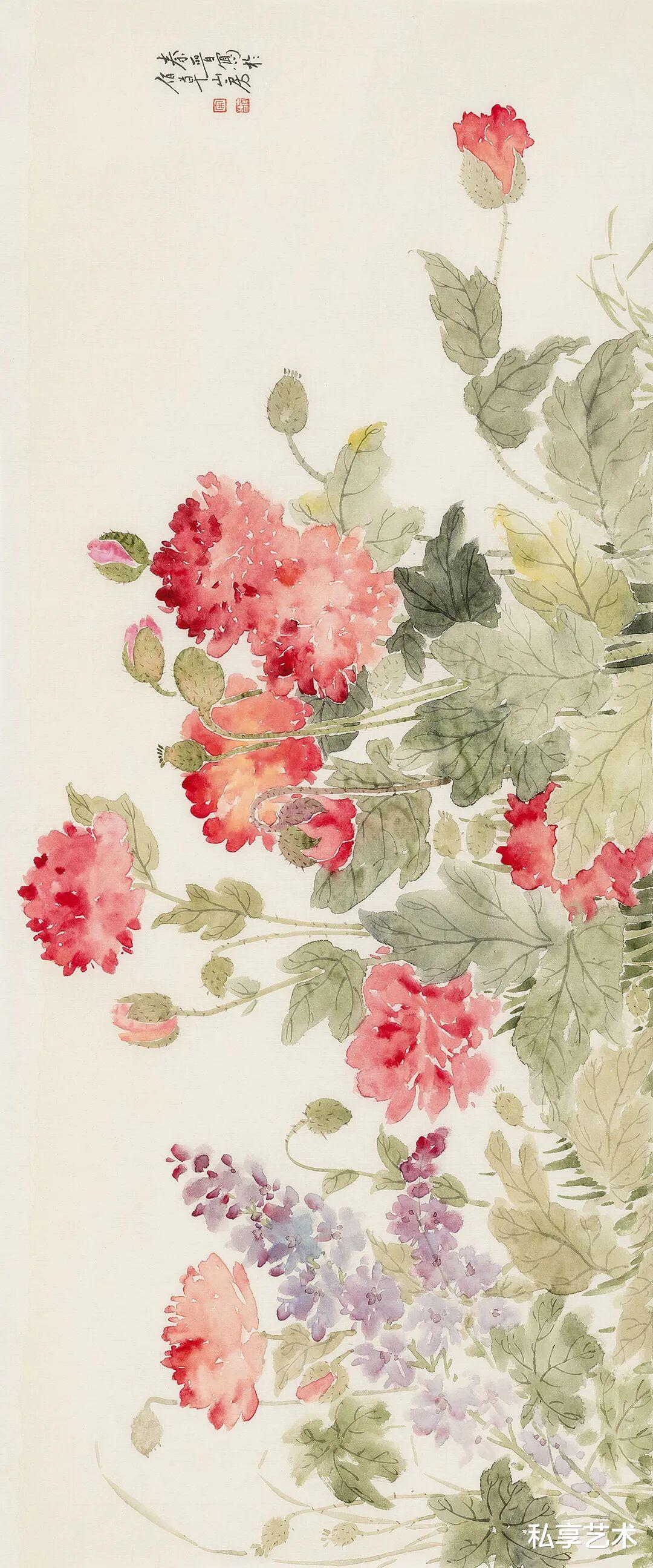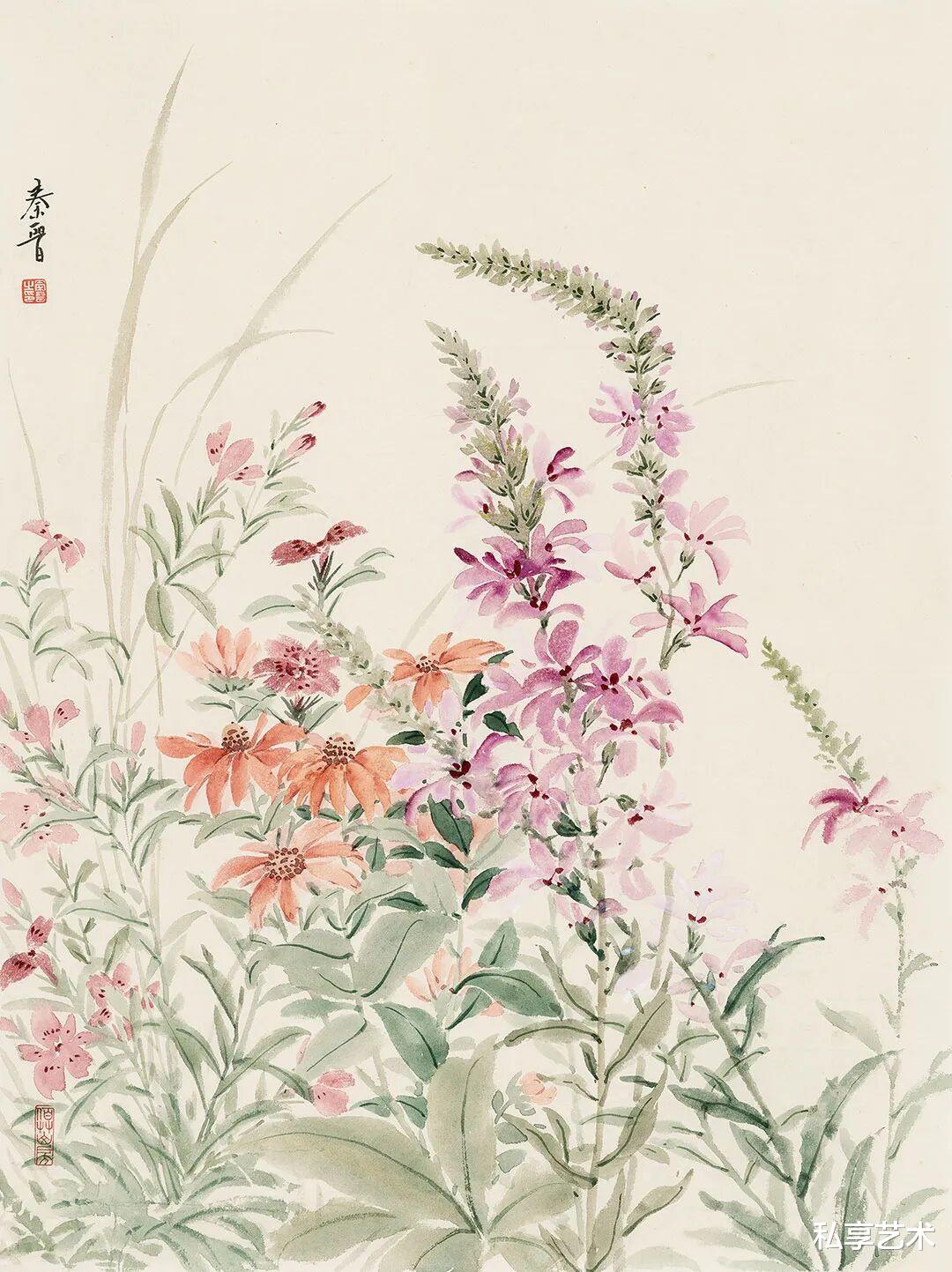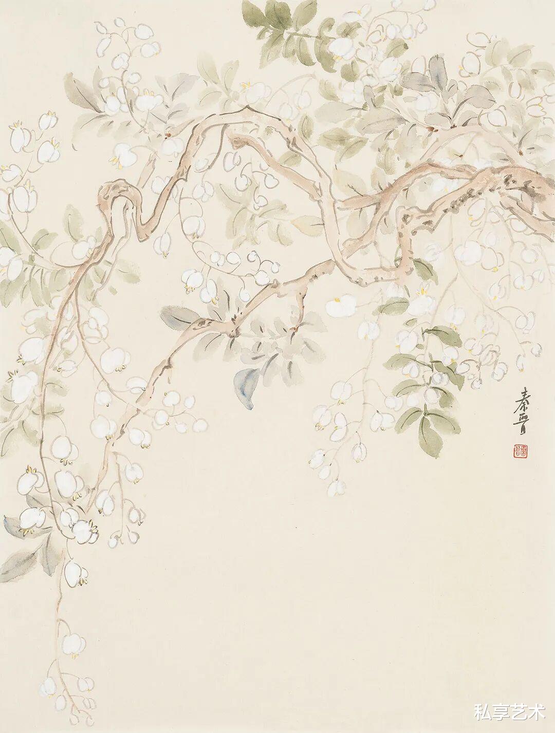 宋秦晋的画作,承袭了中国花鸟画的文脉,却又不为其所囿。她以精微的观察力,捕捉草木最动人的瞬间 —— 一滴露珠的剔透,一片叶脉的蜿蜒,一朵花苞的含羞。她的笔触,既有工笔的严谨与细腻,将物象的形态刻画得丝丝入扣;又融入了写意的灵动与率真,用色清丽脱俗,仿佛汲取了朝露与晚霞的精华,画面总是浸润着一层温润而明亮的光感。这光,并非来自外部,而是源于草木自身内在的生命之力。