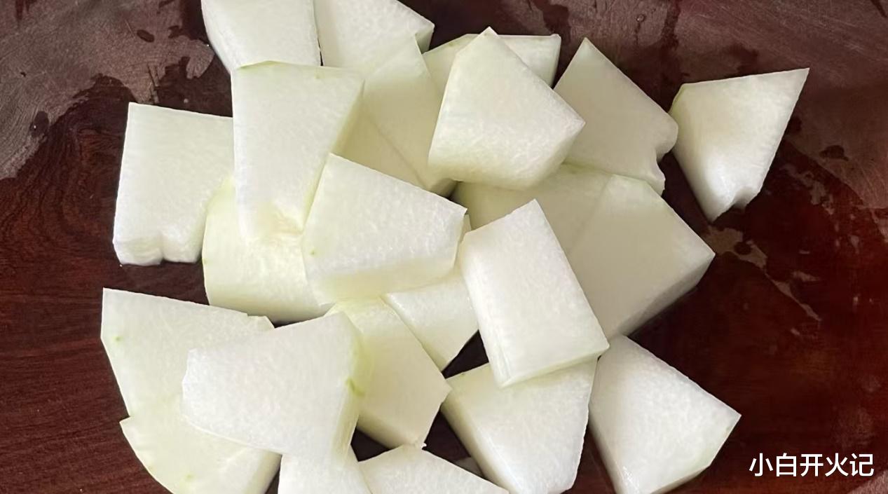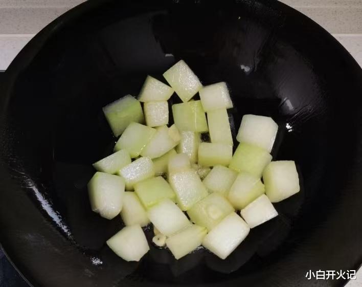 第一步,给冬瓜脱衣服。外皮削干净,瓜瓤掏到只剩纯白的“瓜肉”,切成2 cm见方的小墩子。别切太薄,炖久了容易碎成“冬瓜泥”;也别太厚,吸不进味儿,2 cm刚刚好,像小骰子一样可爱。切完记得用厨房纸吸一下表面水分,待会儿煎的时候不炸锅,还能让边缘快速上色。