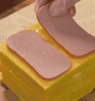 在吐司块的顶部,放上两片午餐肉,喜欢吃肉的朋友一定不能少了这一层!最后,用沙拉酱和番茄酱在午餐肉上随便画点造型,颜值瞬间拉满!