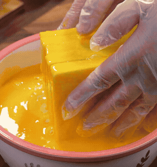 叠好的吐司块,放入打散的鸡蛋液里裹上一层。一定要每个地方都裹到蛋液,这样烤出来才会香喷喷的、外酥里嫩。