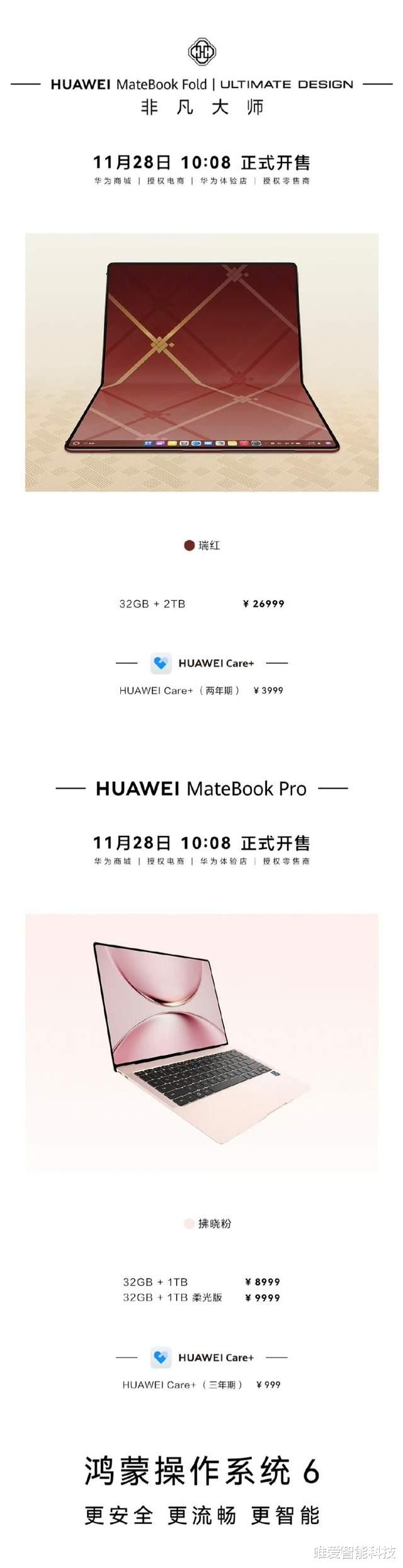售价方面,全新配色华为MateBook Fold 非凡大师 瑞红32GB / 2TB版售价26999元;华为MateBook Pro 拂晓粉32GB/1TB版本售价为8999元,32GB/1TB柔光版售价9999。