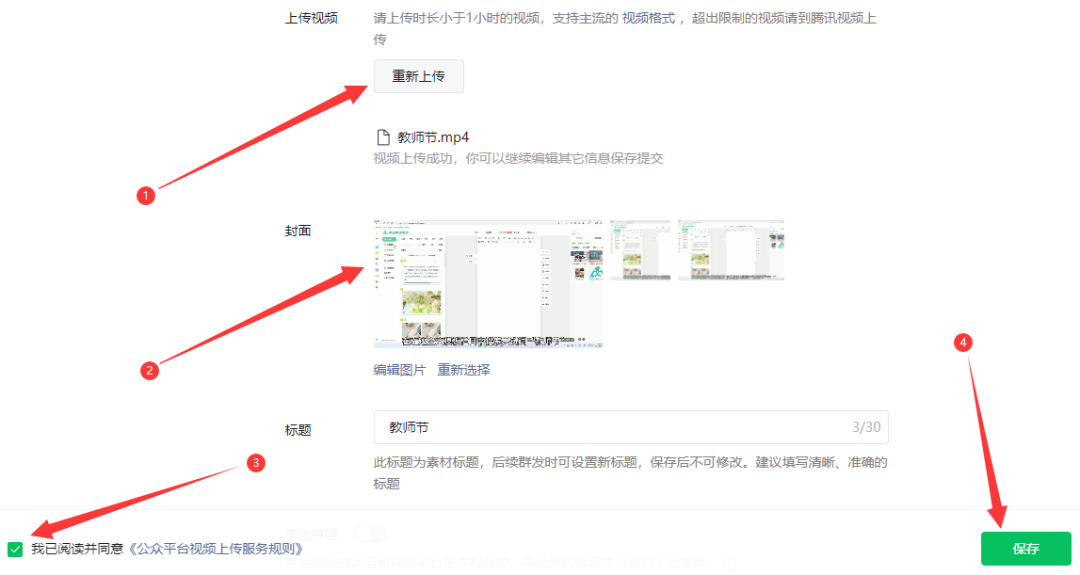 第二步:上传视频后,选择一个封面图,勾选“我已阅读并同意《公众平台视频上传服务规则》”,点击保存。