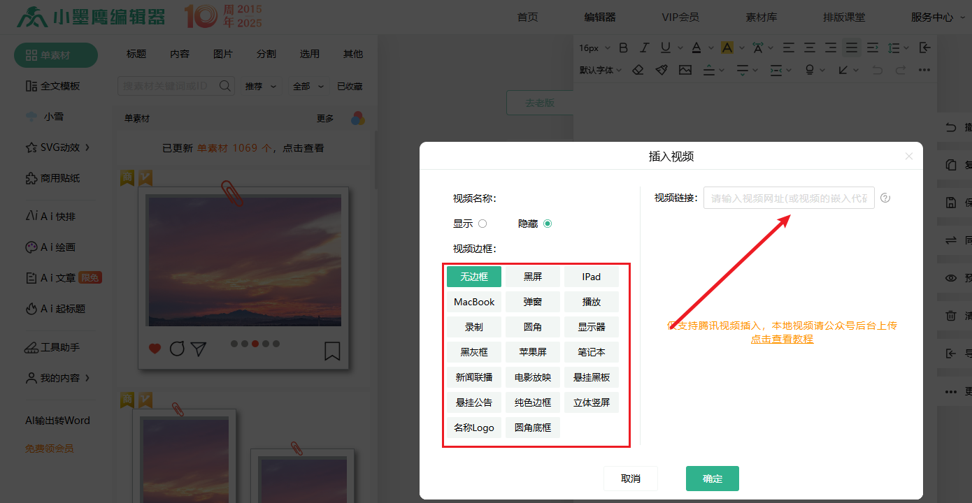 同时,我们可以使用编辑器在文章中插入视频。打开小墨鹰编辑器,点击顶部工具栏中的插入视频。输入视频链接插入即可。