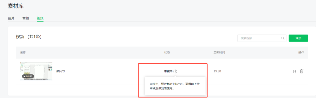 点击保存后,会有提示“审核中,预计耗时1小时内,”测试发现一般的审核时间只有3-5分钟,视频审核通过后,再进行下一步