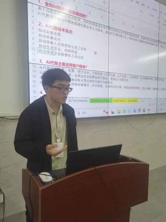 培训中,叶萧晗导师围绕AI 智能代账的核心功能展开深入教学。结合金税四期 “以数治税” 的行业背景,通过理论讲解、案例演示与实时实操相结合的方式,重点拆解了智能票据识别、自动化账务核算、全税种一键申报等关键模块。针对票据录入效率低、申报流程繁琐等行业痛点,导师现场演示了 AI 工具如何实现 20 余种票据的秒级识别,以及通过内置 3000 + 行业科目模板自动生成记账凭证的操作流程,直观展现了智能代账将重复性工作效率提升的技术优势。此外,培训还涵盖了政策实时同步、税务风险智能预警等实用功能,通过典型案例分析,帮助参训人员掌握 AI 工具在规避财税风险中的应用方法。