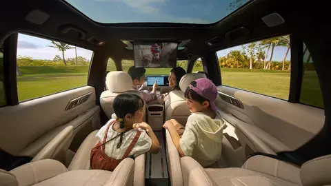 这套系统可厉害了,多设备之间能无缝切换,你手机上的东西能直接传到车上,交互起来特别快,一点都不卡。特别要说的是,后排那个吸顶屏,还有专门给小朋友准备的AI小精灵,它能跟孩子双语互动,还能陪读,这样长途旅行的时候,孩子们就不会觉得无聊了。