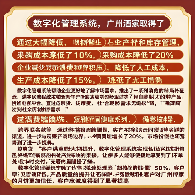 通过实施数字化管理系统,广州酒家取得了显著的成果。成本大幅降低,通过精准采购和库存管理,企业减少了原材料浪费和库存积压,采购成本降低了 10%,库存成本降低了 20%。生产流程的优化也提高了生产效率,降低了人工成本,生产成本降低了 15%。销售额显著增长,数字化管理系统帮助企业更好地了解市场需求,推出了一系列符合市场需求的新产品,如低糖健康系列、跨界联名款等,满足了不同消费群体的需求,进一步拓宽了市场边界。通过电商平台、直播带货、社交媒体营销等多种渠道,实现了与消费者的无缝连接,让更多人能够便捷地享受到这份来自岭南的美味。销售额同比增长了 20%,市场份额也得到了进一步提升。客户满意度大幅提升,数字化管理系统实现了订单的快速处理和产品的及时交付,客户投诉率降低了 50%。产品质量的提升也让客户对广州酒家的月饼更加信任,客户忠诚度得到了显著提高