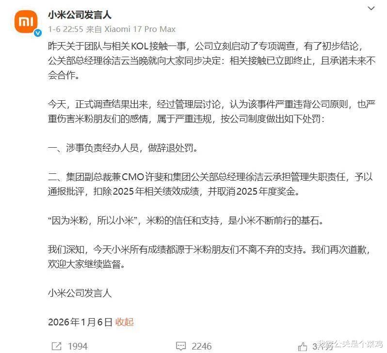 面对外界压力,最终,小米选择了公开道歉,承诺与该博主永不合作,并处罚了事件相关人员。