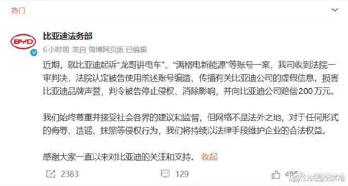 所以我们也能够看到许多企业开设了XX法务部的账号,并且不定期更新处理进度。比如上个月,某自媒体被判赔偿比亚迪200万元;11月,柴怼怼被判赔偿胖东来260万元。