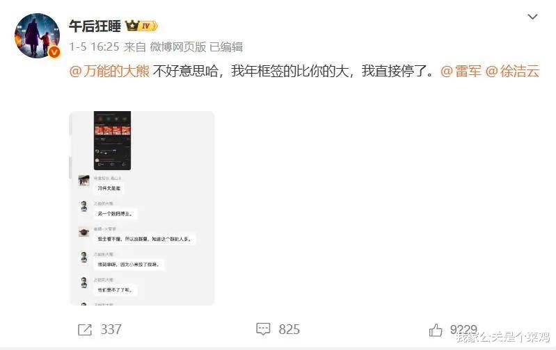 1月5日16:25,米黑大V大熊在某行业群里自爆,小米与其达成了投放合作;后米系大V“午后狂睡”在社媒上公开晒出了该聊天截图,并表示暂停与小米一切合作,米粉也因此感到不满,质疑小米价值观;
