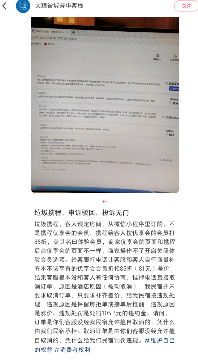 近日有酒店商家在社交媒体上,吐槽携程申诉驳回,投诉无门。