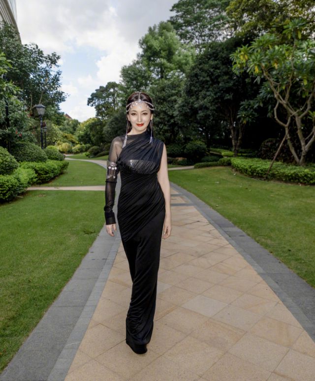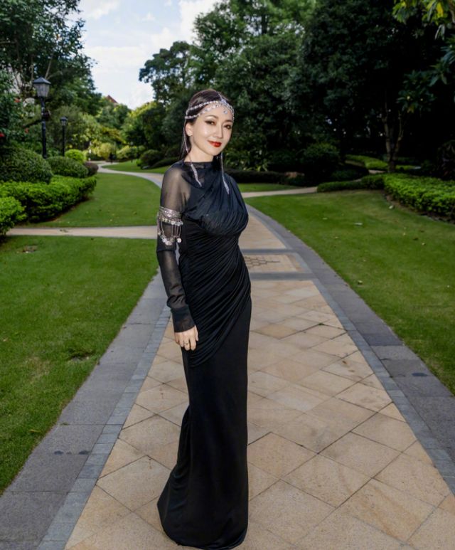 而她晒出的6张美照,全都是她身穿黑色长裙,在花园里拍摄的照片。