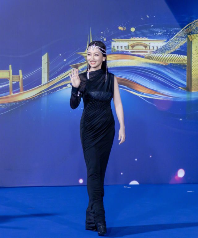 身穿这身黑色长裙现身活动时候的她,脸上洋溢着灿烂的笑容,状态看起来非常好。