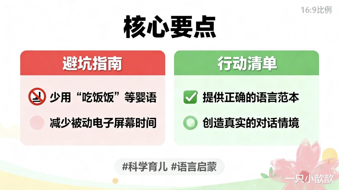 3. 使用宝宝语:避免说“吃饭饭”“喝水水”等叠词,而是用规范句式:“宝宝要吃饭了”“我们该喝水了。”