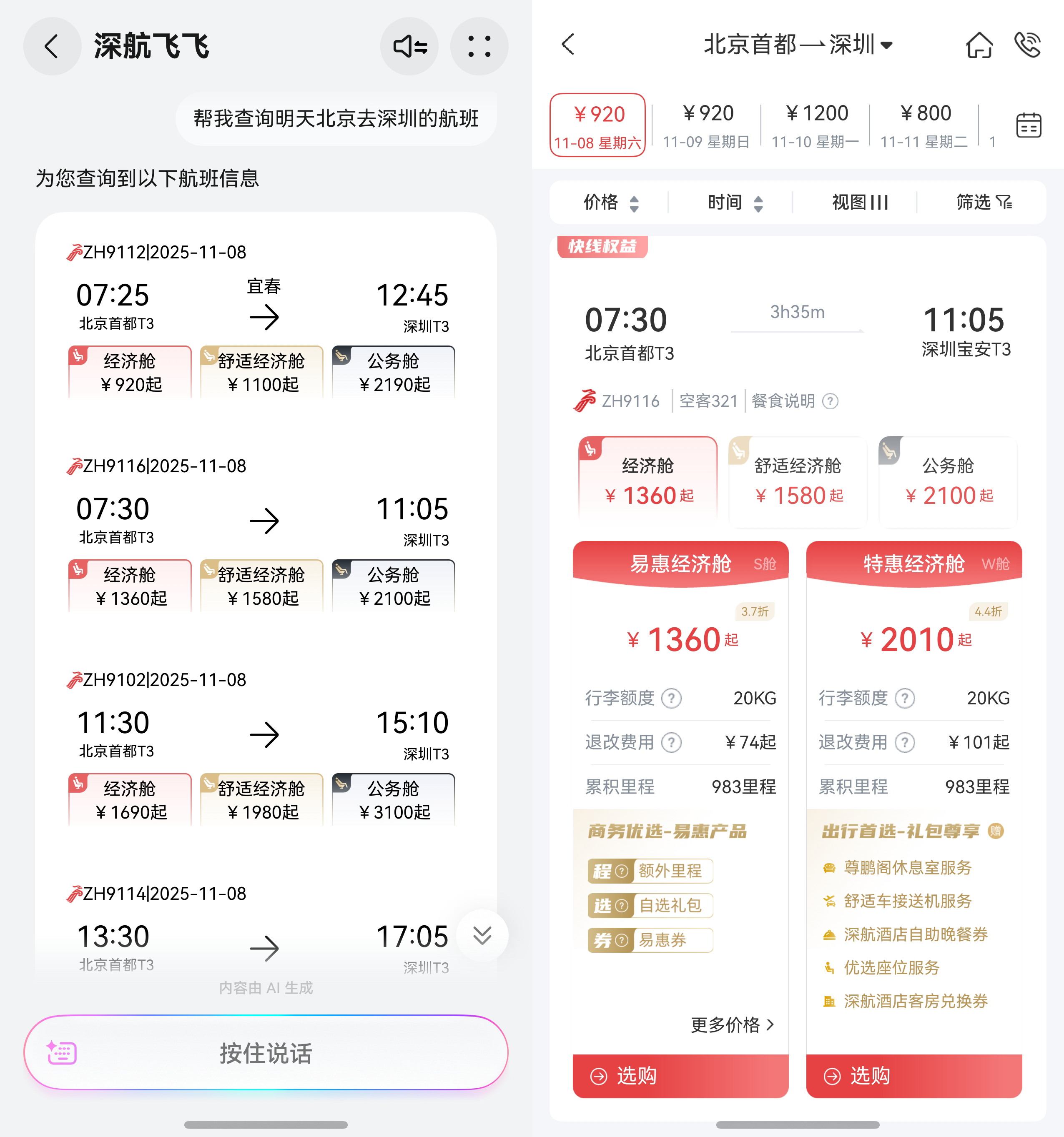 就拿订机票说吧,比如我想订一张去深圳的机票,直接调出“深航飞飞”说:帮查询明天北京去深圳的航班,它就能把符合要求的航班、价格、时间全列出来,点击对应航班就能直接进入买票界面。这种一步到位的体验,在以前是很难想象的。如果需要退改签,直接把需求“一句话”告诉“深航飞飞”,它就能辅助你完成退改签全过程,完全不用自己折腾。