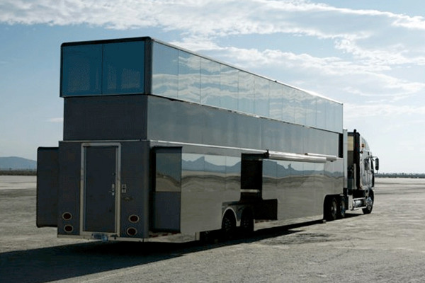 超级房车顾名思义是要求有超级高的自持力,超级高的可靠性,具备穿越性能的房车。超级房车能不能从里面看出一台小车呢?也可以,但不是从侧面出来的,而是从车尾通过一个翻板的形式出来的,因为他们的车身结构不同,包括他们的会客区和卧室的拓展舱,以及车顶上的阳台、天台啊,各种拓展机构也是不一样的。
