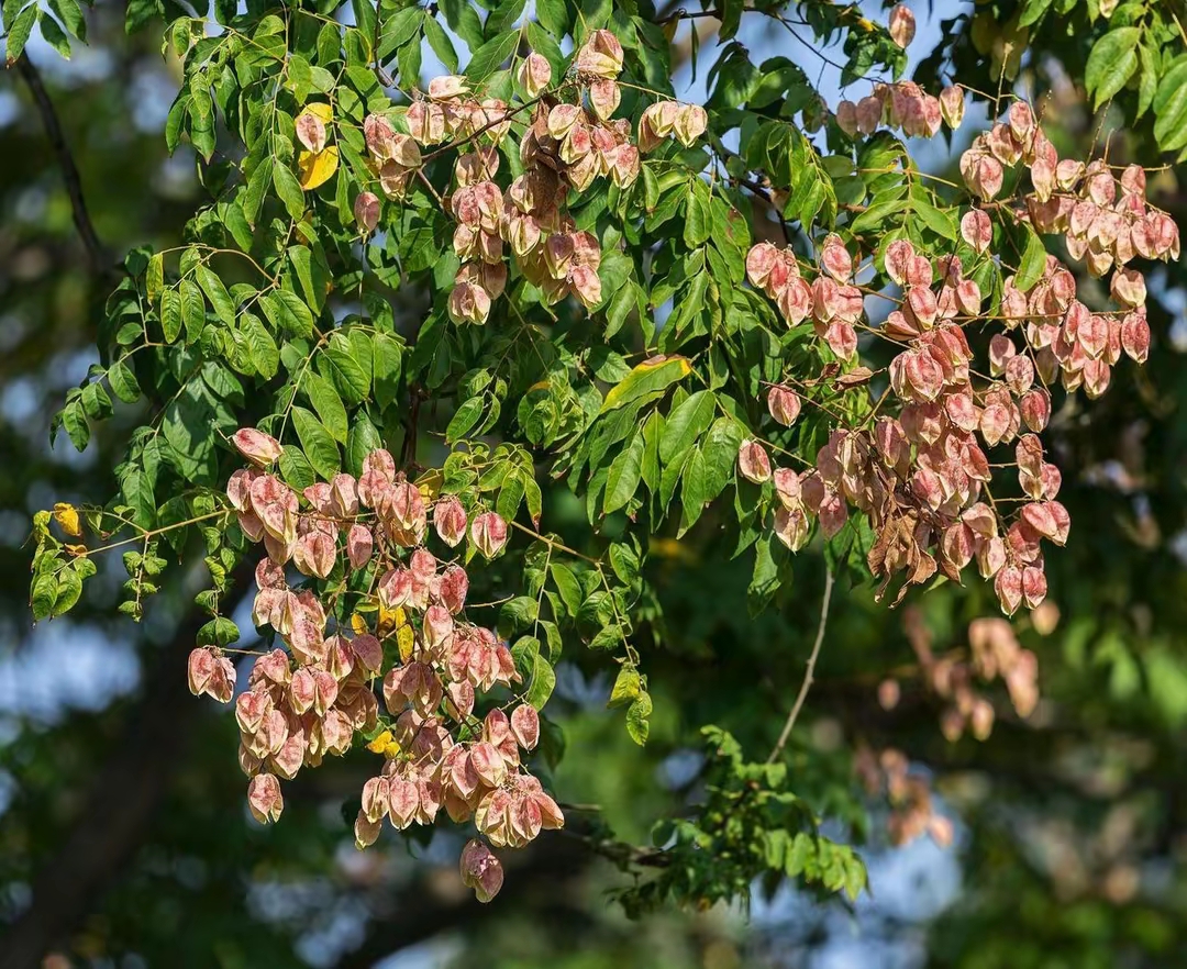 它的叶子是寻常的绿,算不得稀奇。花也小,碎金子似的,风一过,就簌簌地往下掉,在柏油路上铺出斑驳的图案,很快又被扫去。人们大抵是看不见这些的。夏末秋初,栾树开始结果。那果是三瓣合抱的蒴果,薄如蝉翼,形似灯笼。起初是青白色,带着嫩绿的血脉,而后一天天被秋气染透。先是在边缘泛起红晕,像少女的羞赧;继而整个果囊都转为淡绯,最后定格为一种深沉的、近乎于绛红的色彩。成千上万盏这样的“灯笼”骤然挂上枝头,将整棵树点燃。