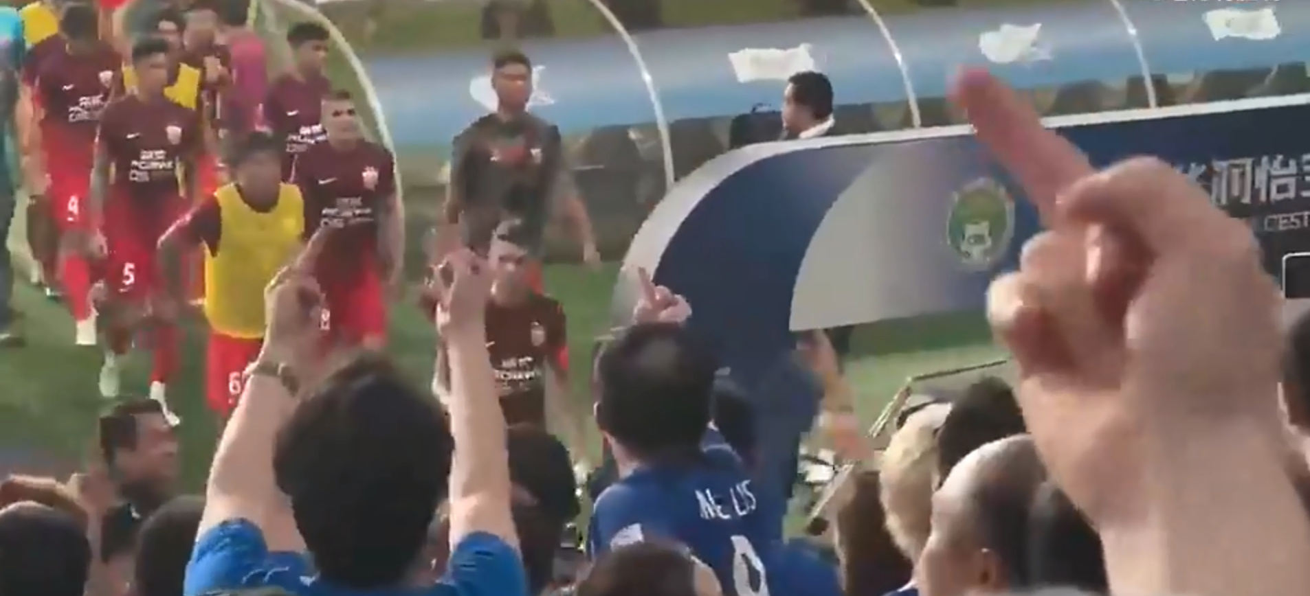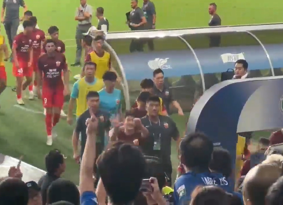 比赛结束,海港球员离场,进休息室的路上需要经过申花球迷看台,于是迎接他们的是疾风骤雨般的咒骂和不断竖起的中指。