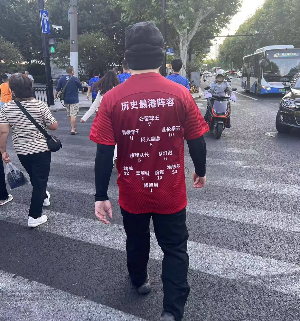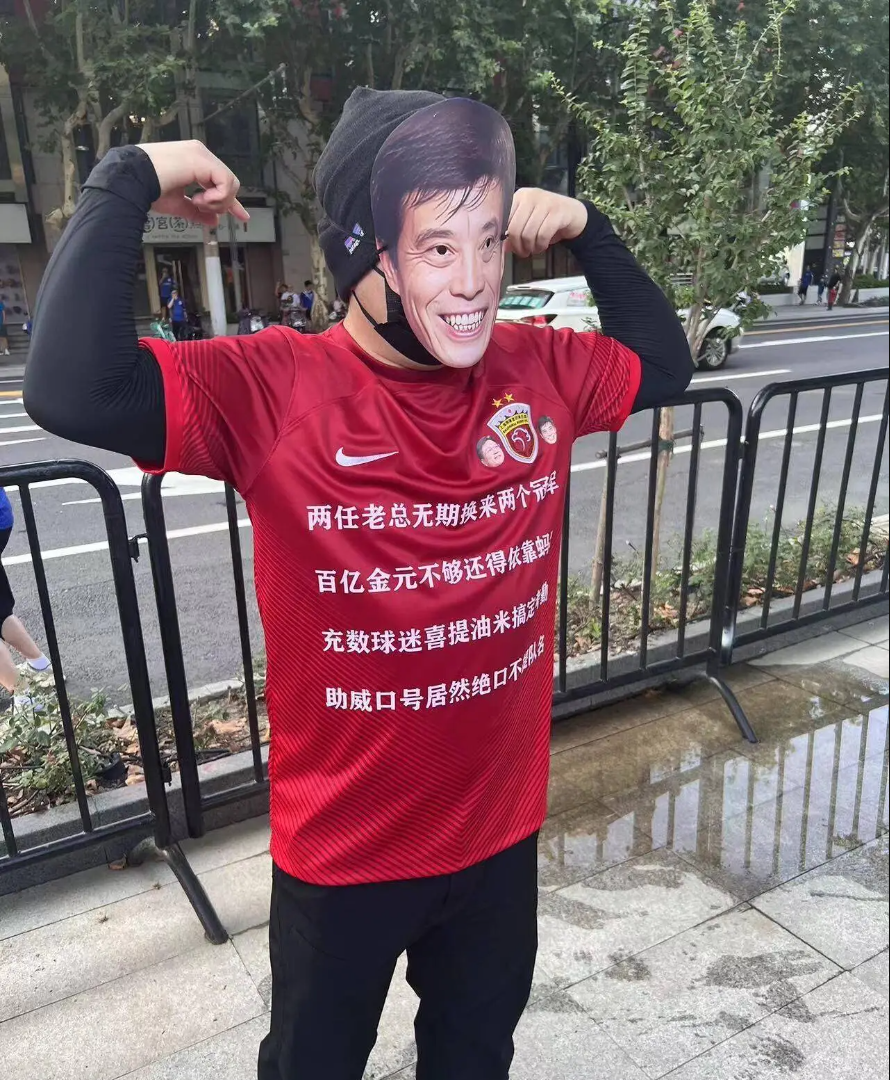 有一位极端球迷,身上穿了一件红色上海海港球衣,不过球衣正面和背后都写满了侮辱海港的语句: