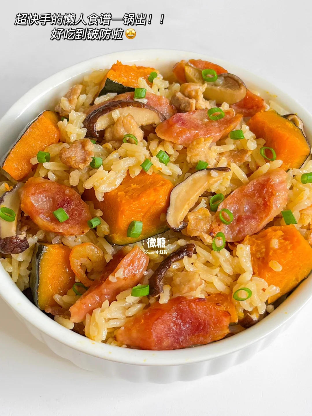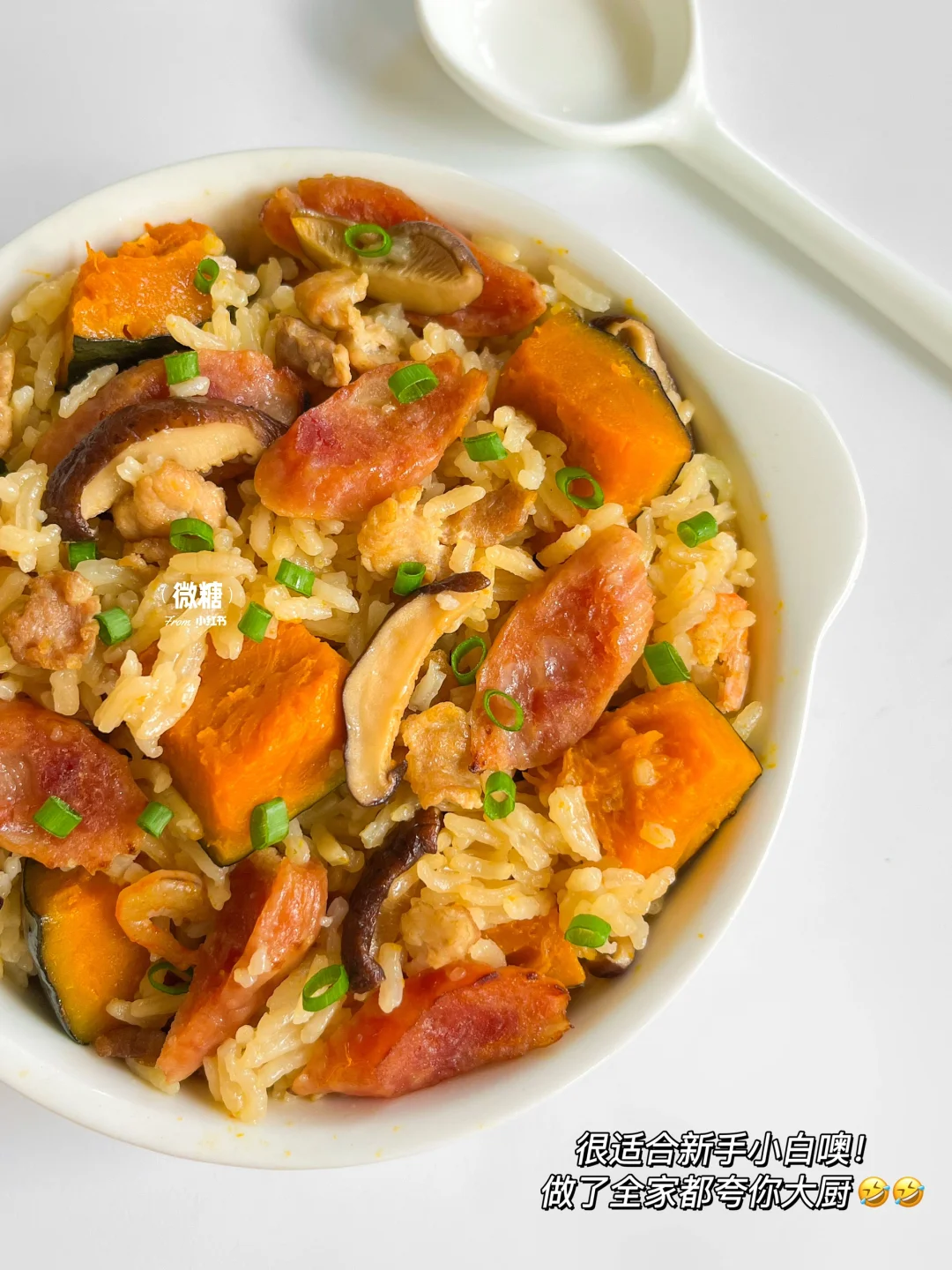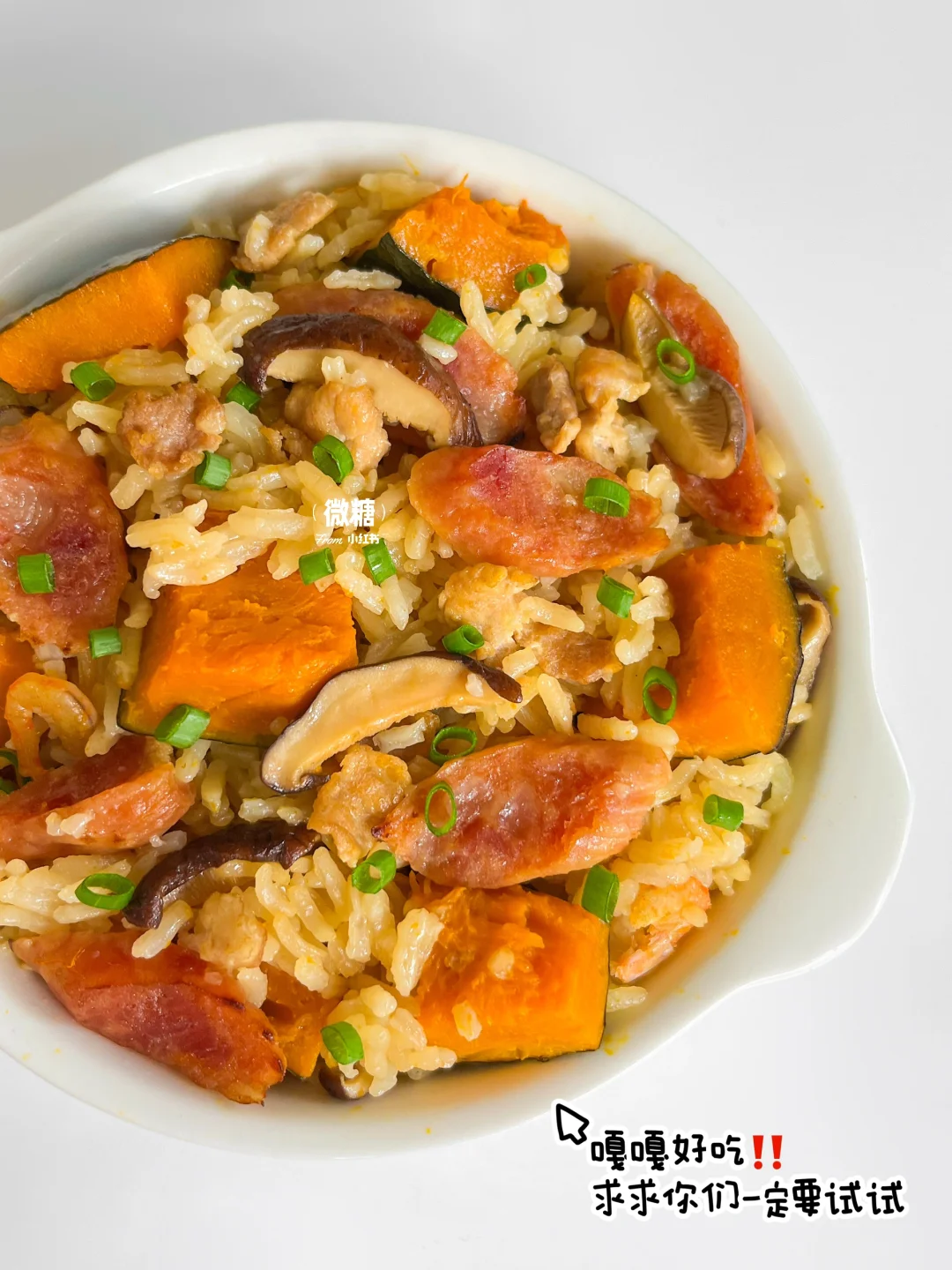 今天分享这款好吃到全家都夸的南瓜焖饭💥一揭锅满屋飘香~真的香迷糊了🤩做法简单到不得了,一看就会,味道真的超级超级赞‼️米饭吸满了肉香和腊肠的咸甜,南瓜的香甜~记得多焖点米饭,不然真的不够吃啊😋