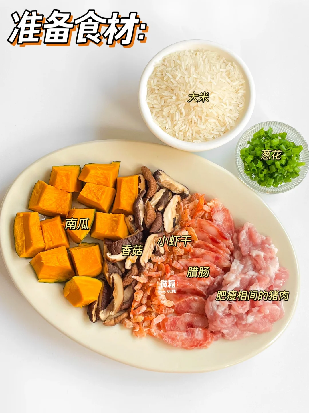 南瓜,腊肠,虾干,五花肉,香菇干,大米,葱