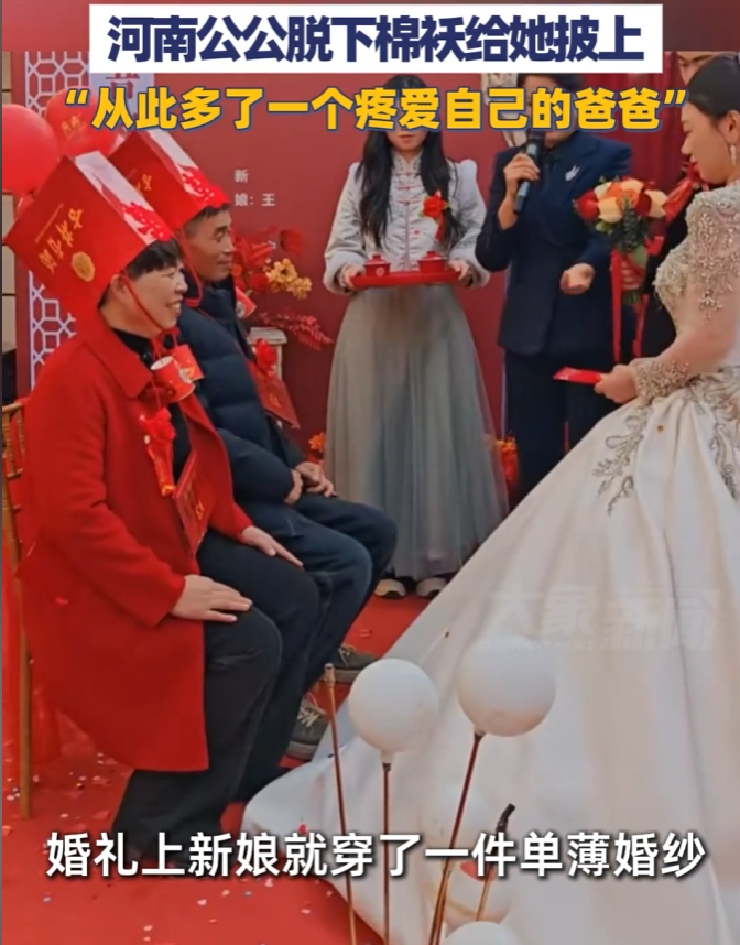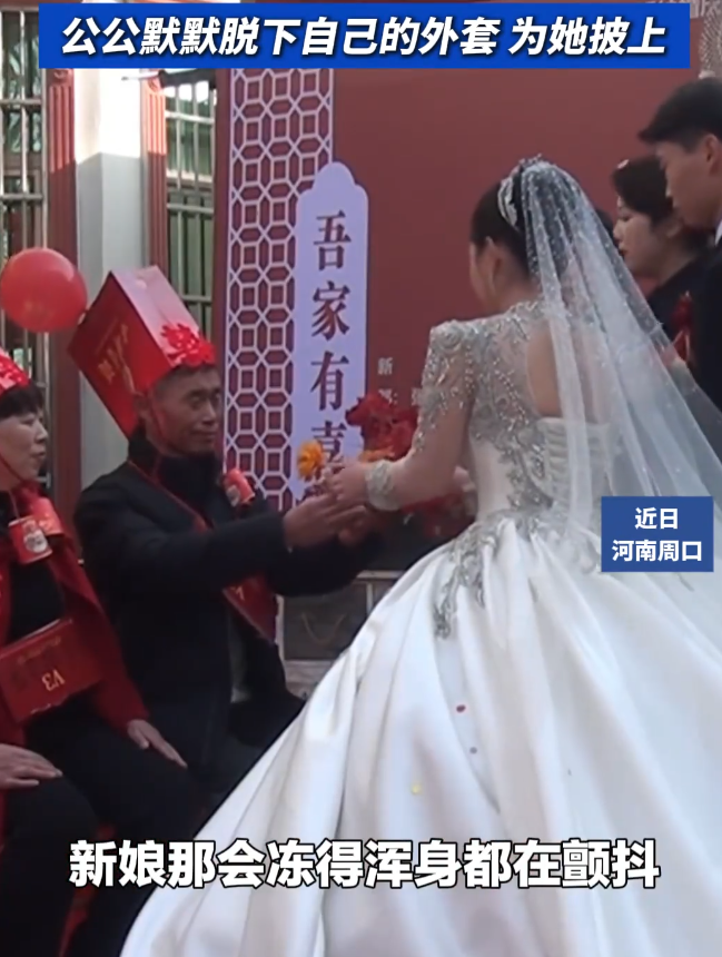 你想想,新娘子穿的是几千上万的洋气婚纱,公公披的是几十块钱、皱巴巴的旧棉袄。这画面瞅着可能有点“不搭”,但那股子热乎劲儿,直接透到了心窝子里。