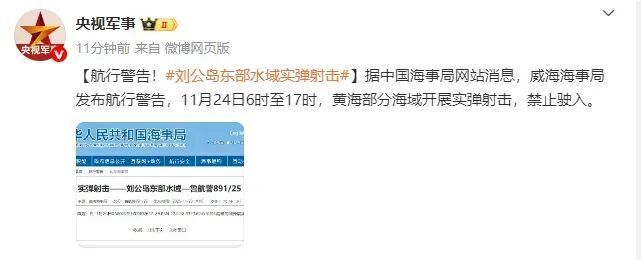 与此同时,威海海事局也宣布,11月24号6点到下午5点,在黄海部分海域进行实弹射击。