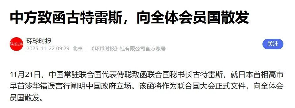 11月21号,中国常驻联合国代表给联合国秘书长古特雷斯致函。