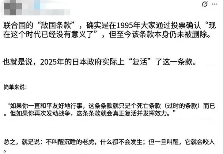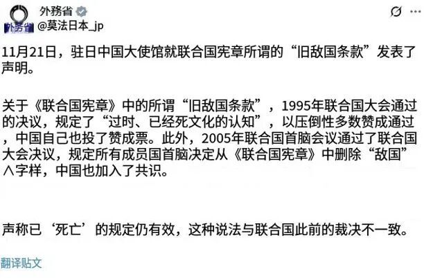 早在11月21号,中国驻日大使馆重申了敌国条款的内容,里面提到德意日等当年的法西斯国家,有再次实施侵略的任何步骤,中国在内的五常不用安理会授权,就能直接动手!