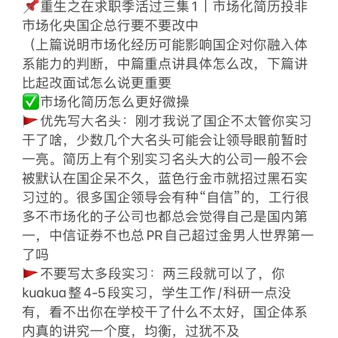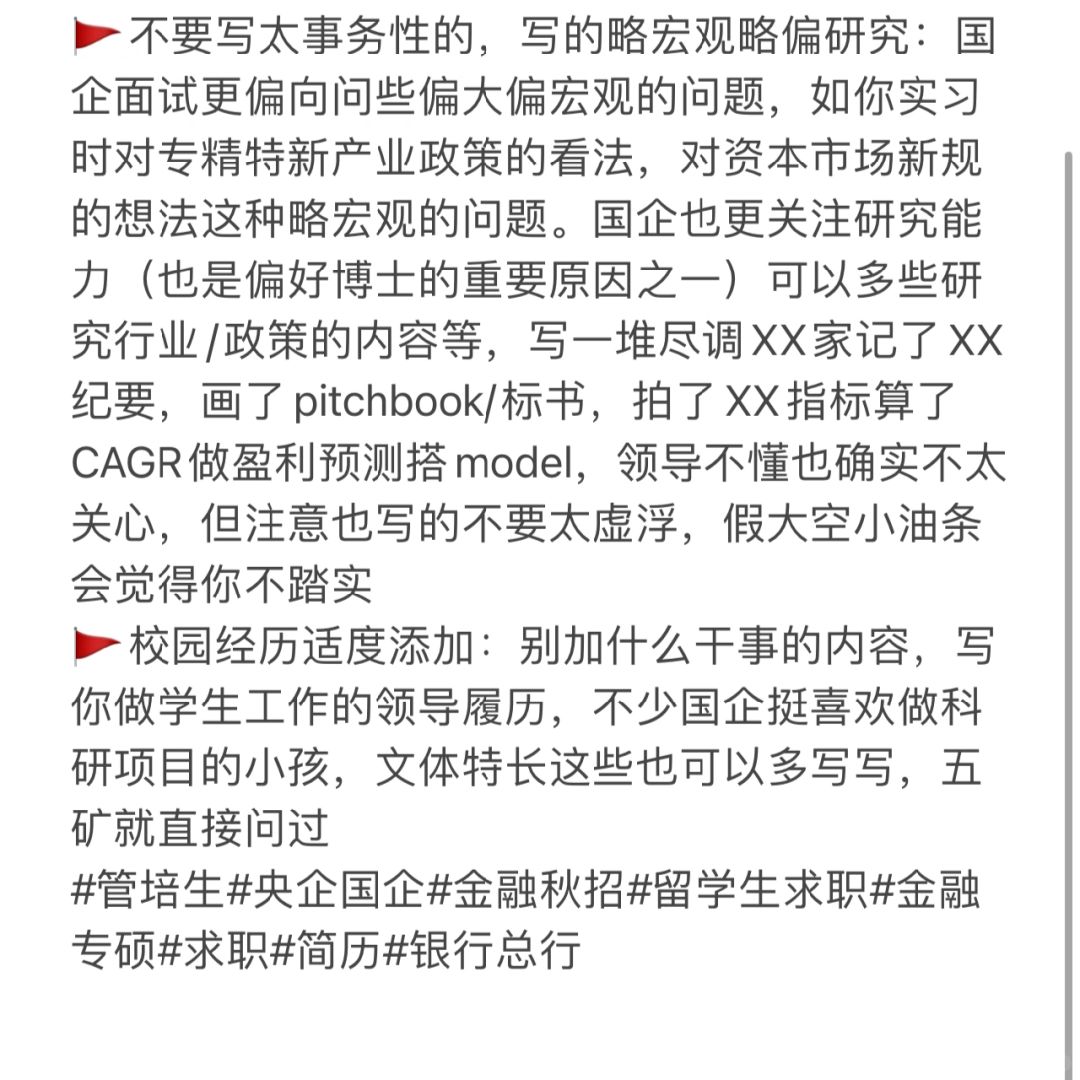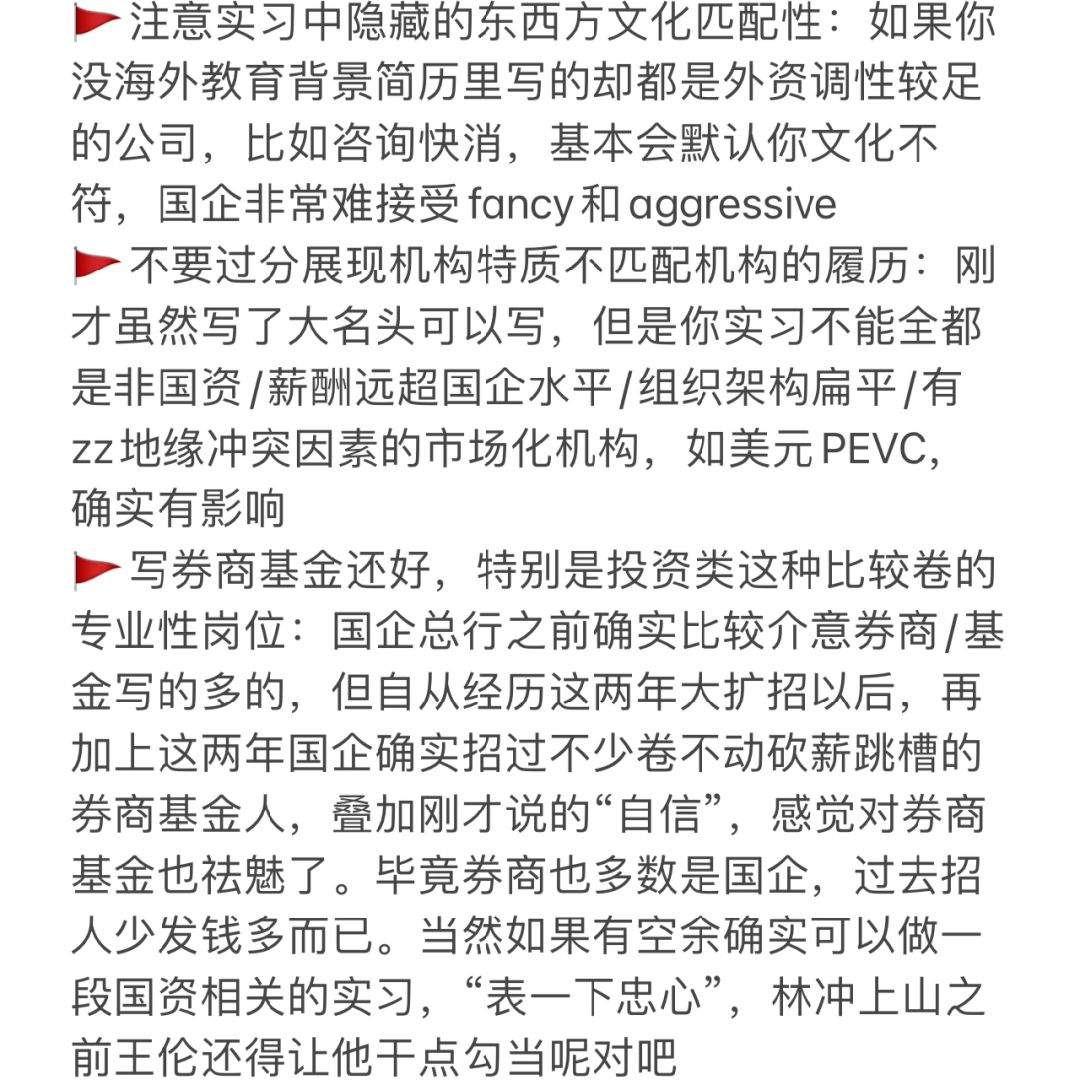 🚩写券商基金还好,特别是投资类这种比较卷的专业性岗位:国企总行之前确实比较介意券商/基金写的多的,但自从经历这两年大扩招以后,再加上这两年国企确实招过不少卷不动砍薪跳槽的券商基金人,叠加刚才说的“自信”,感觉对券商基金也祛魅了。毕竟券商也多数是国企,过去招人少发钱多而已。当然如果有空余确实可以做一段国资相关的实习,“表一下忠心”,林冲上山之前王伦还得让他干点勾当呢对吧