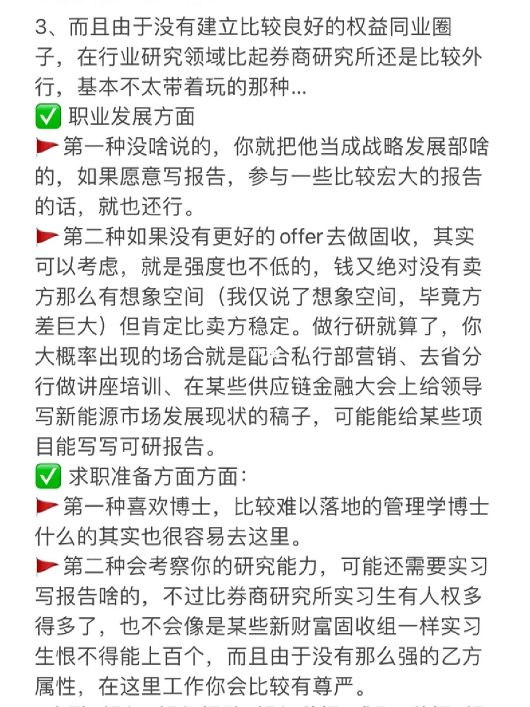 🚩第二种如果没有更好的offer去做固收,其实可以考虑,就是强度也不低的,钱又绝对没有卖方那么有想象空间(我仅说了想象空间,毕竟方差巨大)但肯定比卖方稳定。做行研就算了,你大概率出现的场合就是配合私行部营销、去省分行做讲座培训、在某些供应链金融大会上给领导写新能源市场发展现状的稿子,可能能给某些项目能写写可研报告