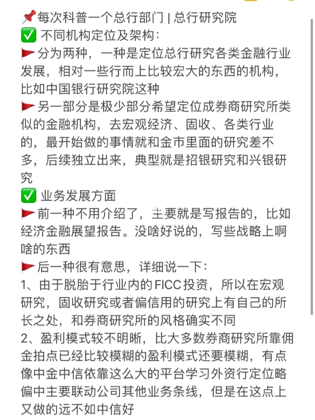 🚩分为两种,一种是定位总行研究各类金融行业发展,相对一些行而上比较宏大的东西的机构,比如中国银行研究院这种,其中有我之前写过的战略部的部分职能,比较务虚
