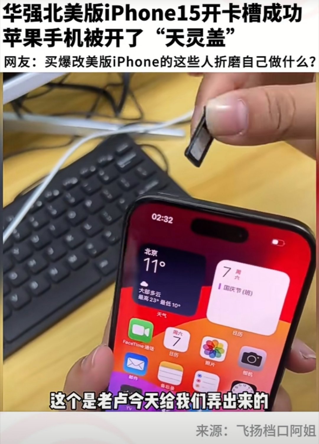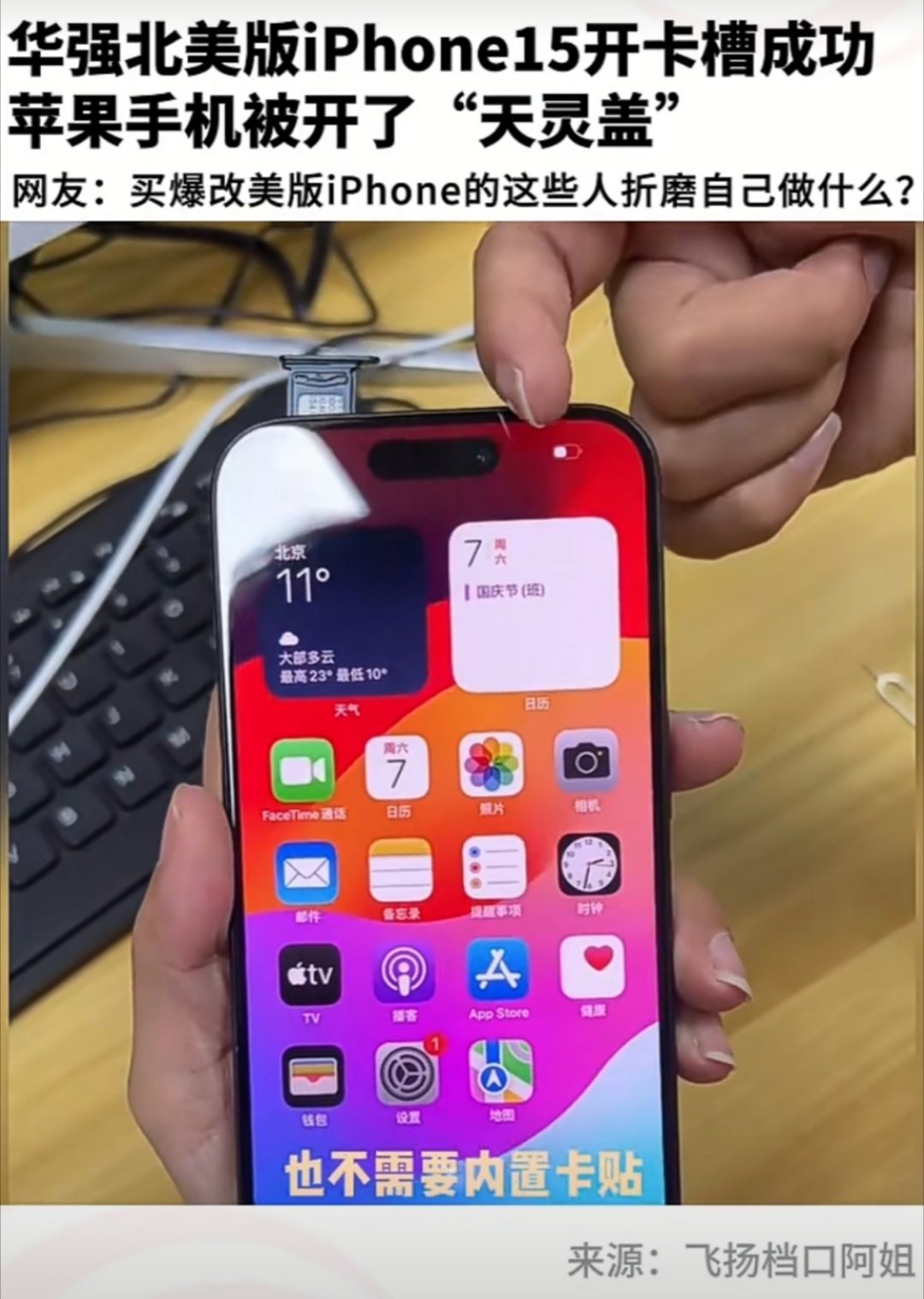 华强北搞出了狠活,美版iPhone 15系列头部开孔,通过把听筒扬声器变小的方式,余出空间加入一个SIM卡位。