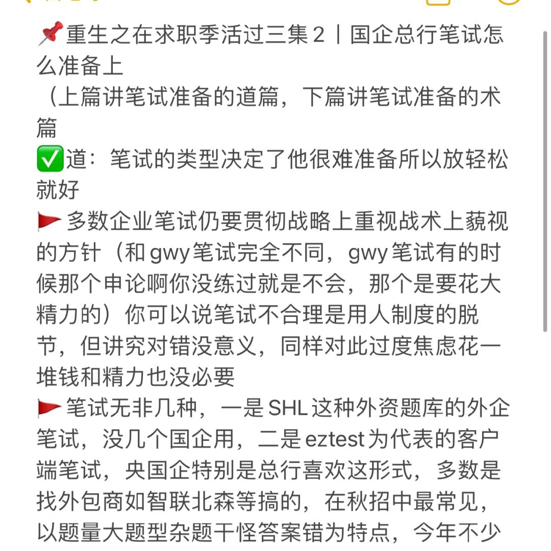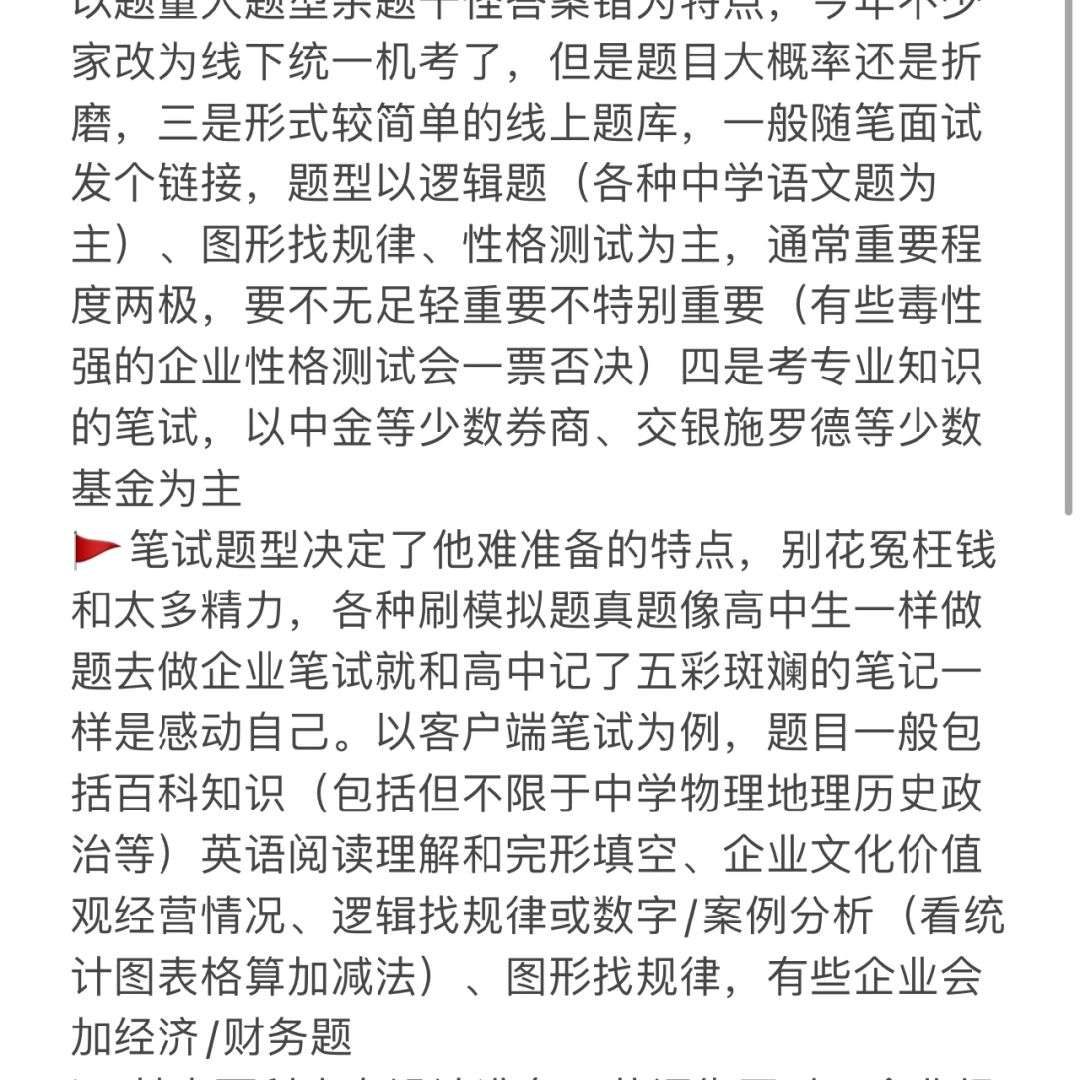 🚩笔试无非几种,一是SHL这种外资题库的外企笔试,没几个国企用,二是eztest为代表的客户端笔试,央国企特别是总行喜欢这形式,多数是找外包商如智联北森等搞的,在秋招中最常见,以题量大题型杂题干怪答案错为特点,今年不少家改为线下统一机考了,但是题目大概率还是折磨,三是形式较简单的线上题库,一般随笔面试发个链接,题型以逻辑题(各种中学语文题为主)、图形找规律、性格测试为主,通常重要程度两极,要不无足轻重要不特别重要(有些毒性强的企业性格测试会一票否决)四是考专业知识的笔试,以中金等少数券商、交银施罗德等少数基金为主