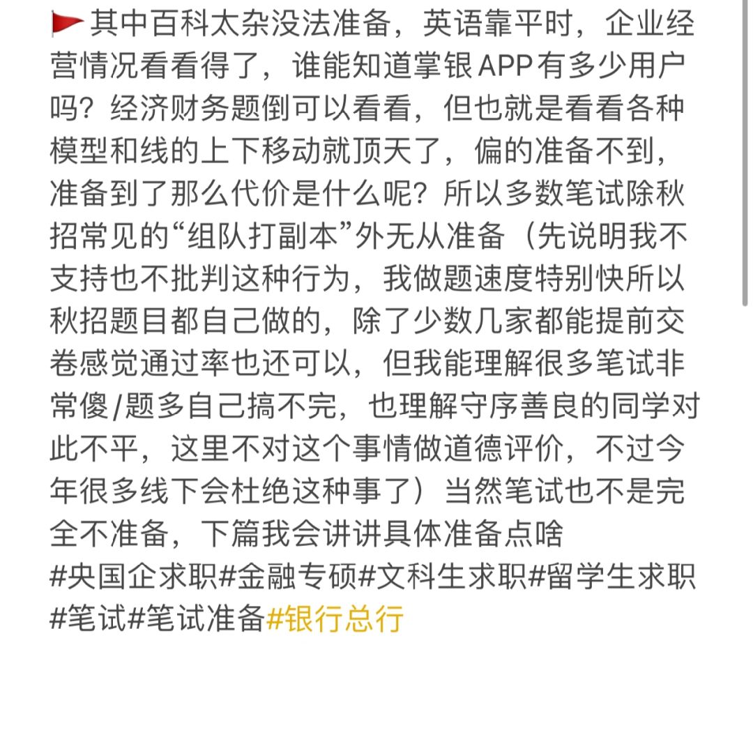 🚩其中百科太杂没法准备,英语靠平时,企业经营情况看看得了,谁能知道掌银APP有多少用户吗?经济财务题倒可以看看,但也就是看看各种模型和线的上下移动就顶天了,偏的准备不到,准备到了那么代价是什么呢?所以多数笔试除秋招常见的“组队打副本”外无从准备(先说明我不支持也不批判这种行为,我做题速度特别快所以秋招题目都自己做的,除了少数几家都能提前交卷感觉通过率也还可以,但我能理解很多笔试非常傻/题多自己搞不完,也理解守序善良的同学对此不平,这里不对这个事情做道德评价,不过今年很多线下会杜绝这种事了)当然笔试也不是完全不准备,下篇我会讲讲具体准备点啥