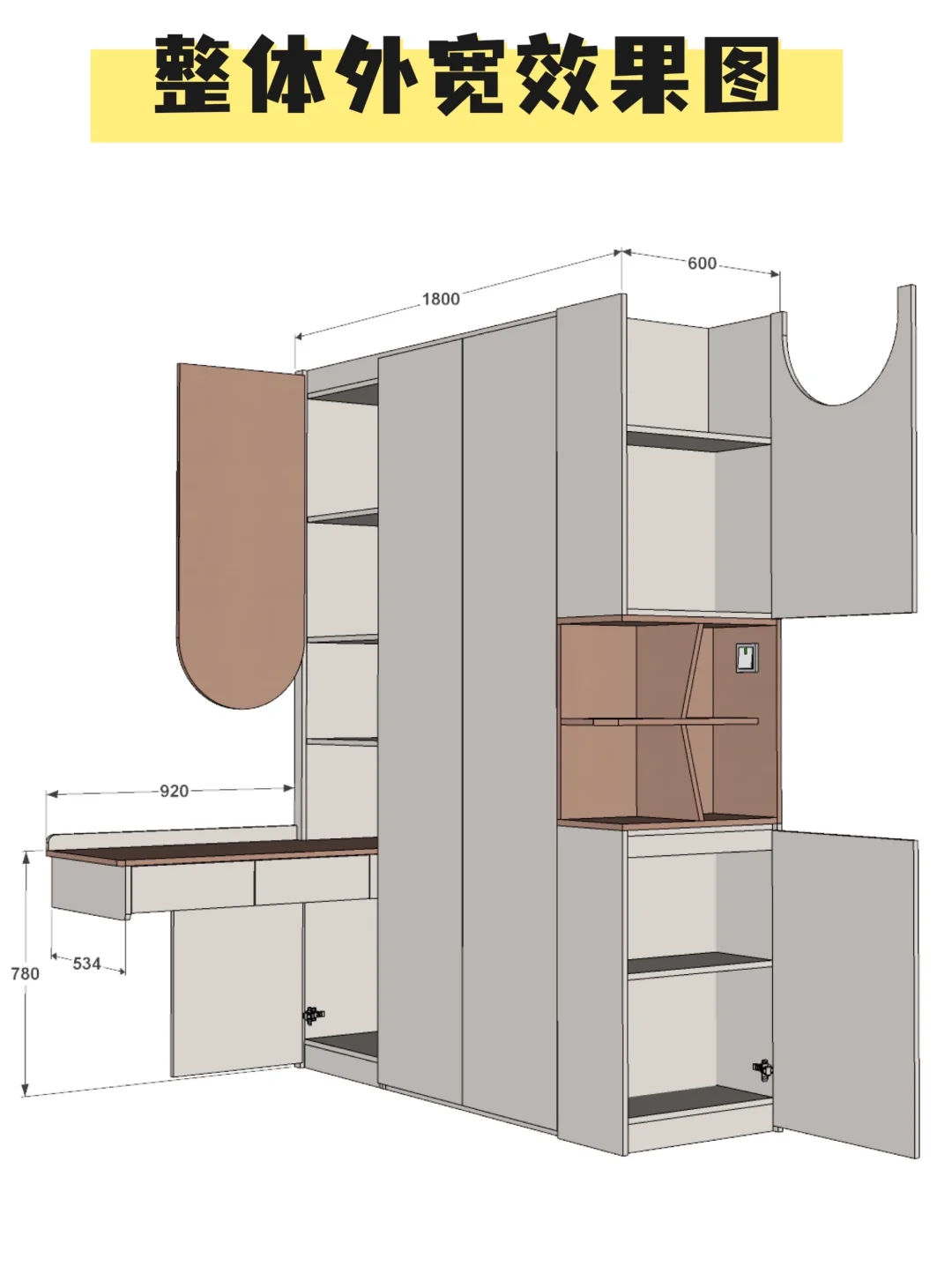 当衣柜干涉到空调出风口的时候不妨这样设计,个性的侧边开放柜和靠床头延伸出一个书桌,小卧室空间也可以有属于自己的书桌啦!