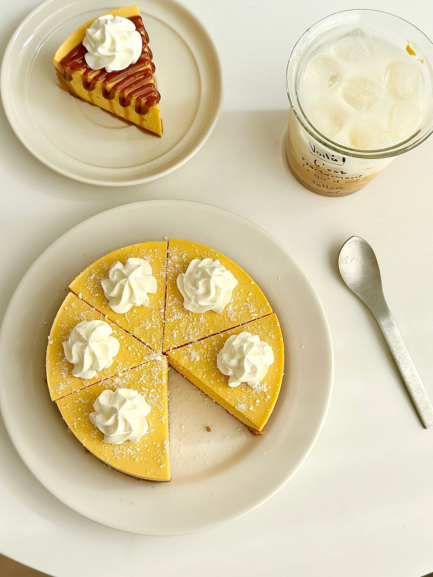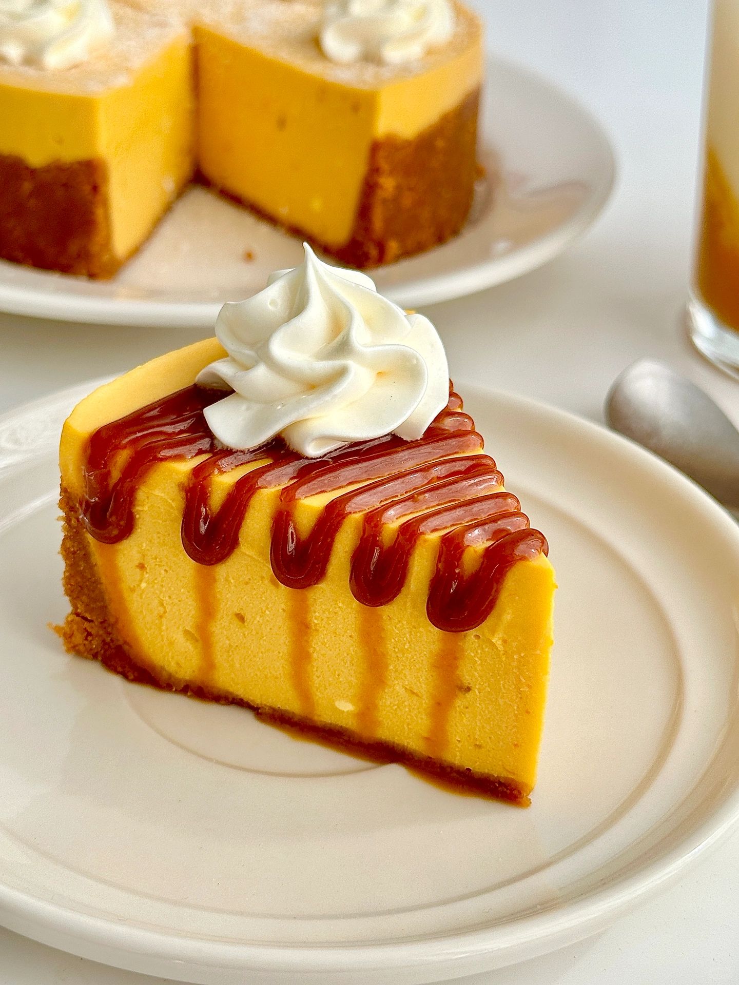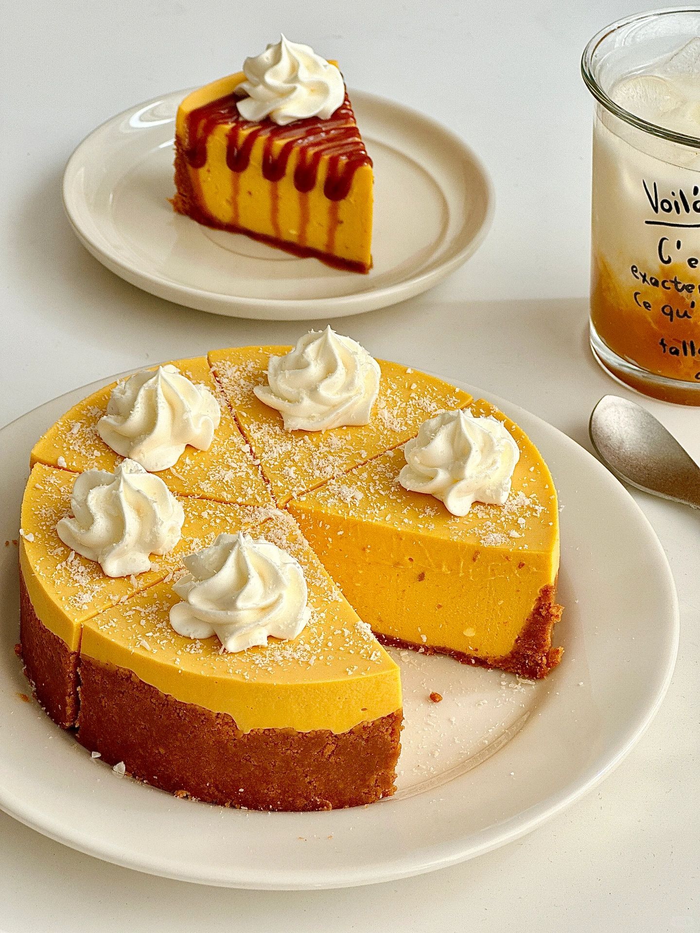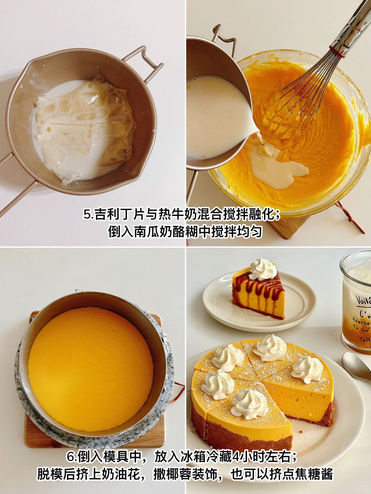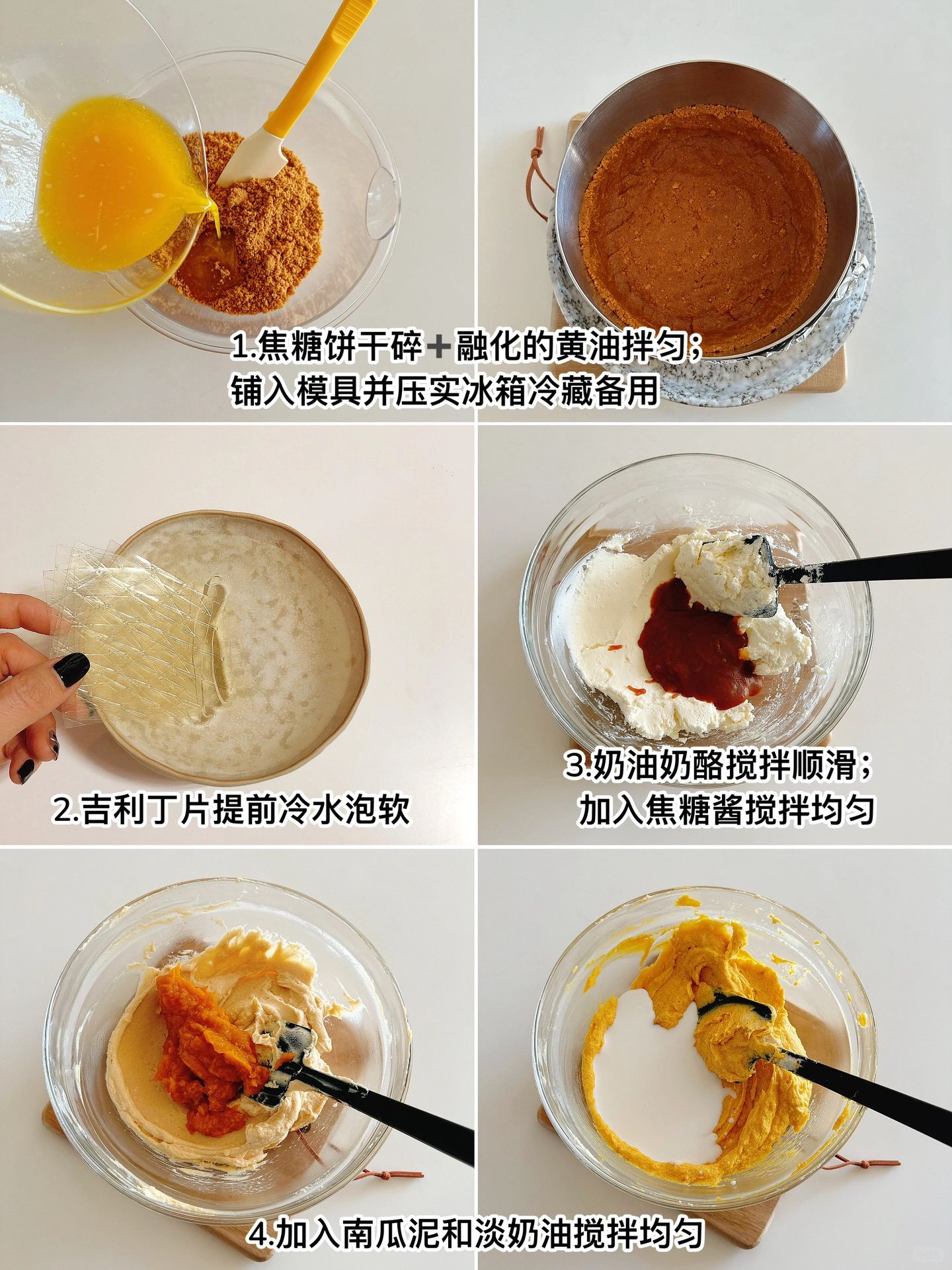 南瓜芝士:奶油奶酪240g|热牛奶60g|吉利丁片8g|淡奶油100g|南瓜泥150g|焦糖酱50g